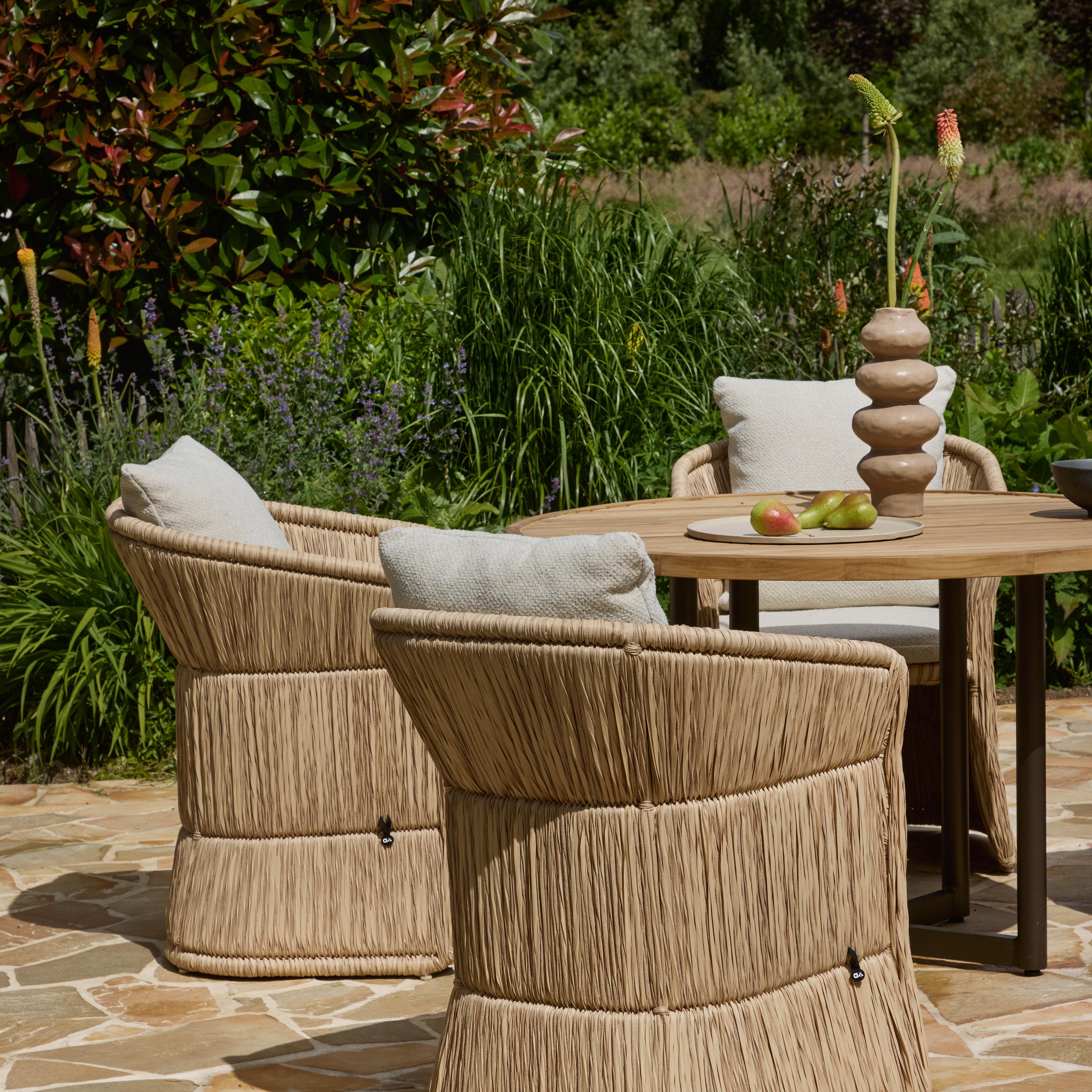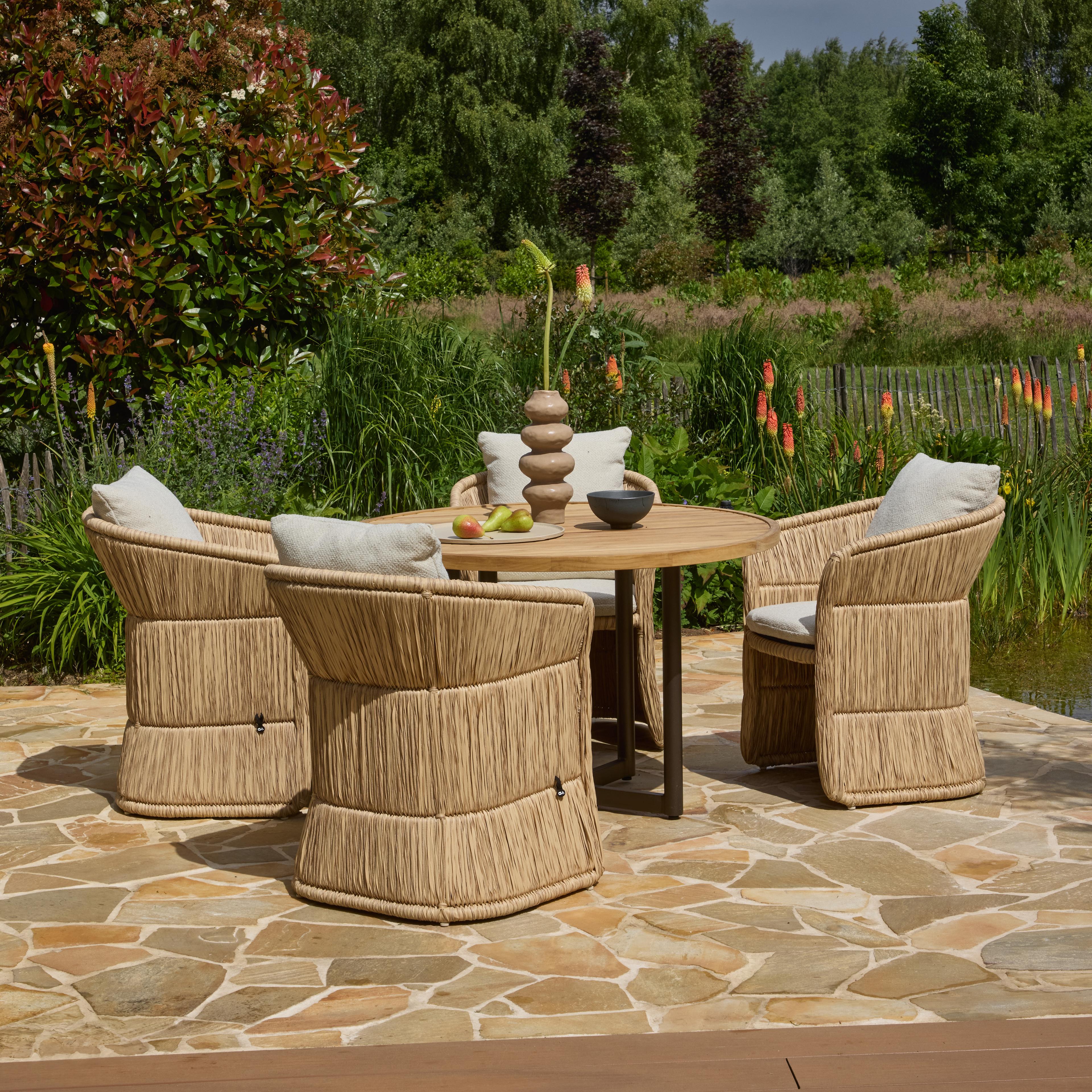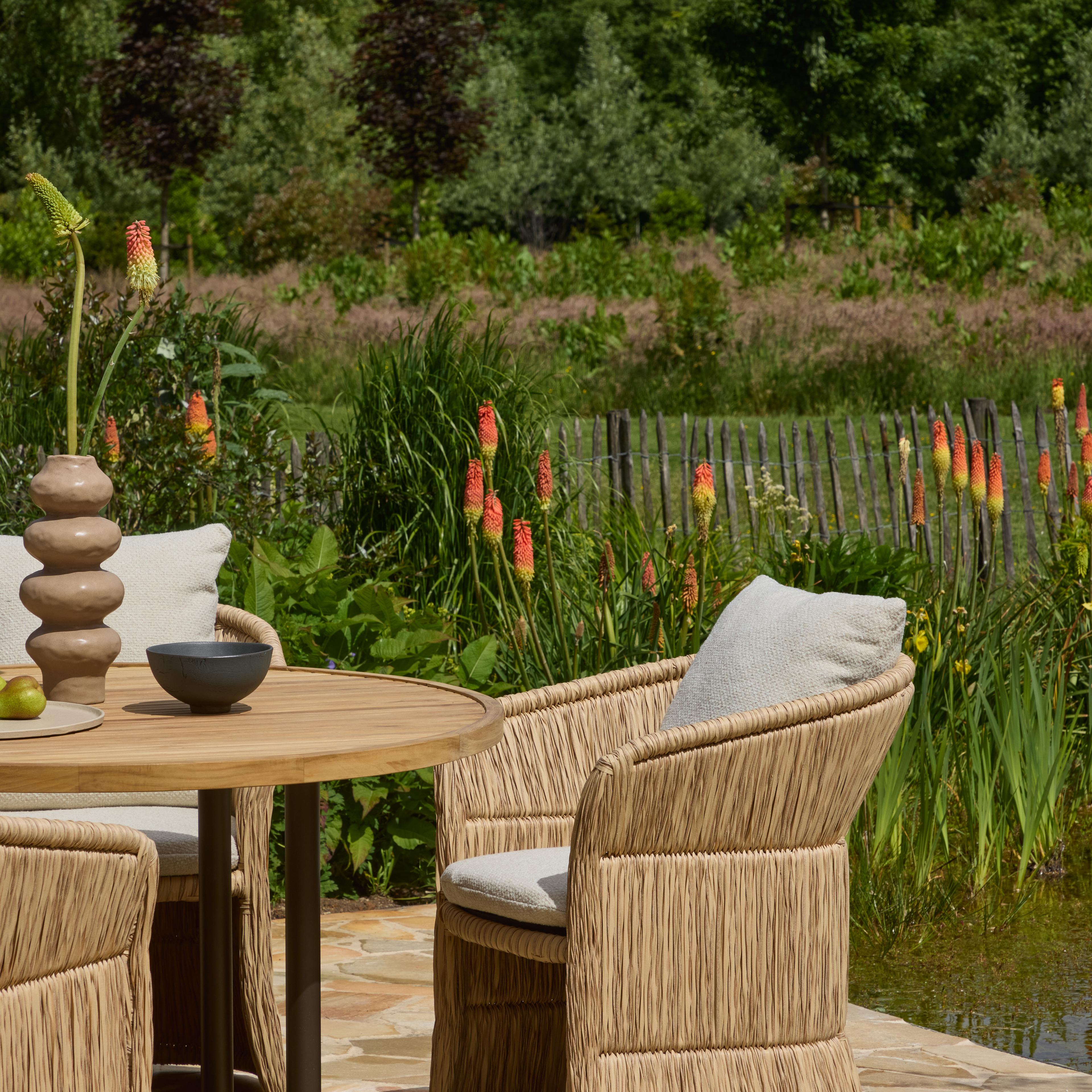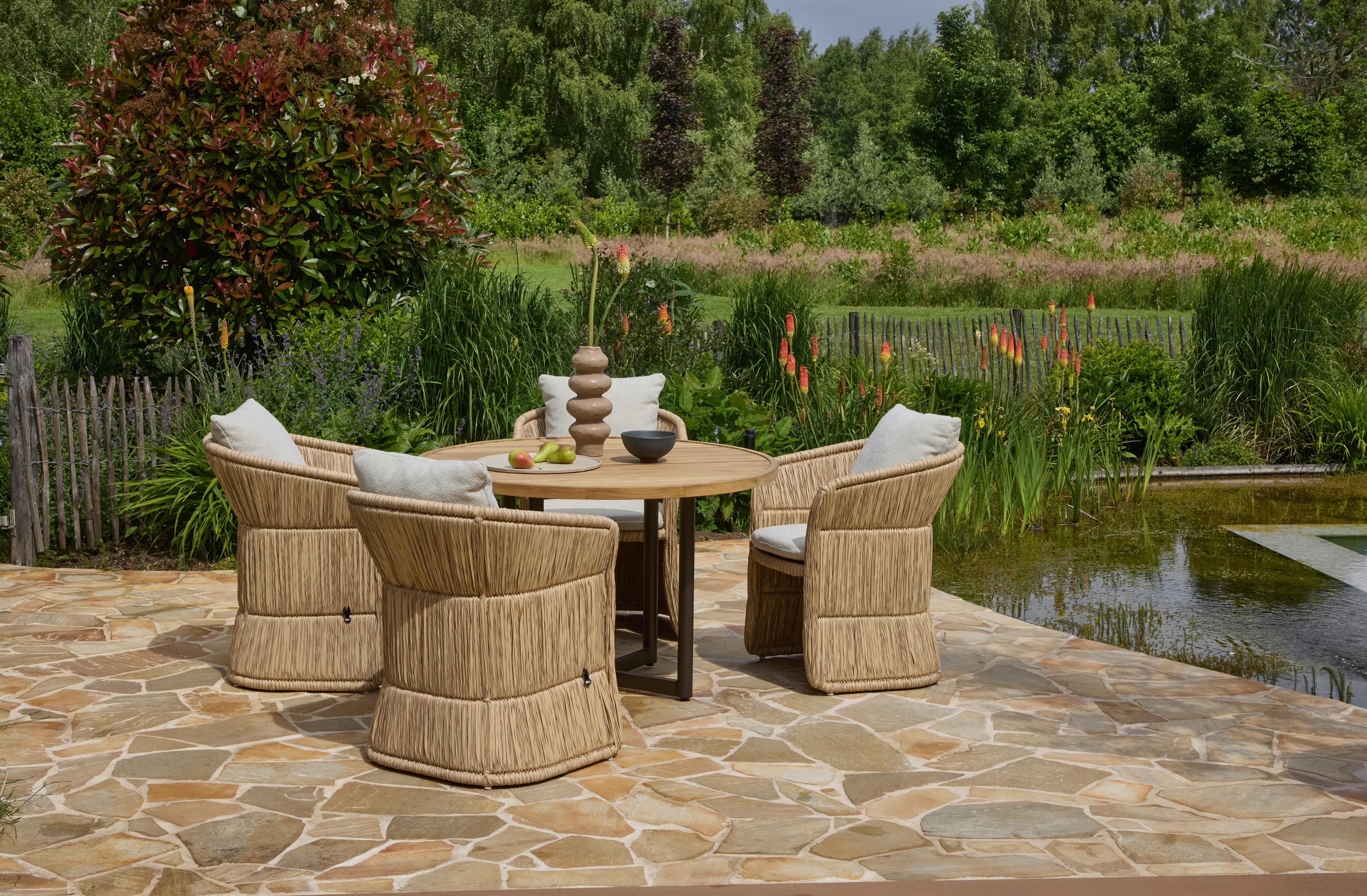 De Gili dining tuinstoel matcht perfect met verschillende tafels. Combineer hem bijvoorbeeld met de Martinique dining tuintafel met zijn unieke 'barrel shape' en royale afmetingen, of met de Jakarta dining tuintafel met een rond of vierkant teakhouten blad en aluminium onderstel.