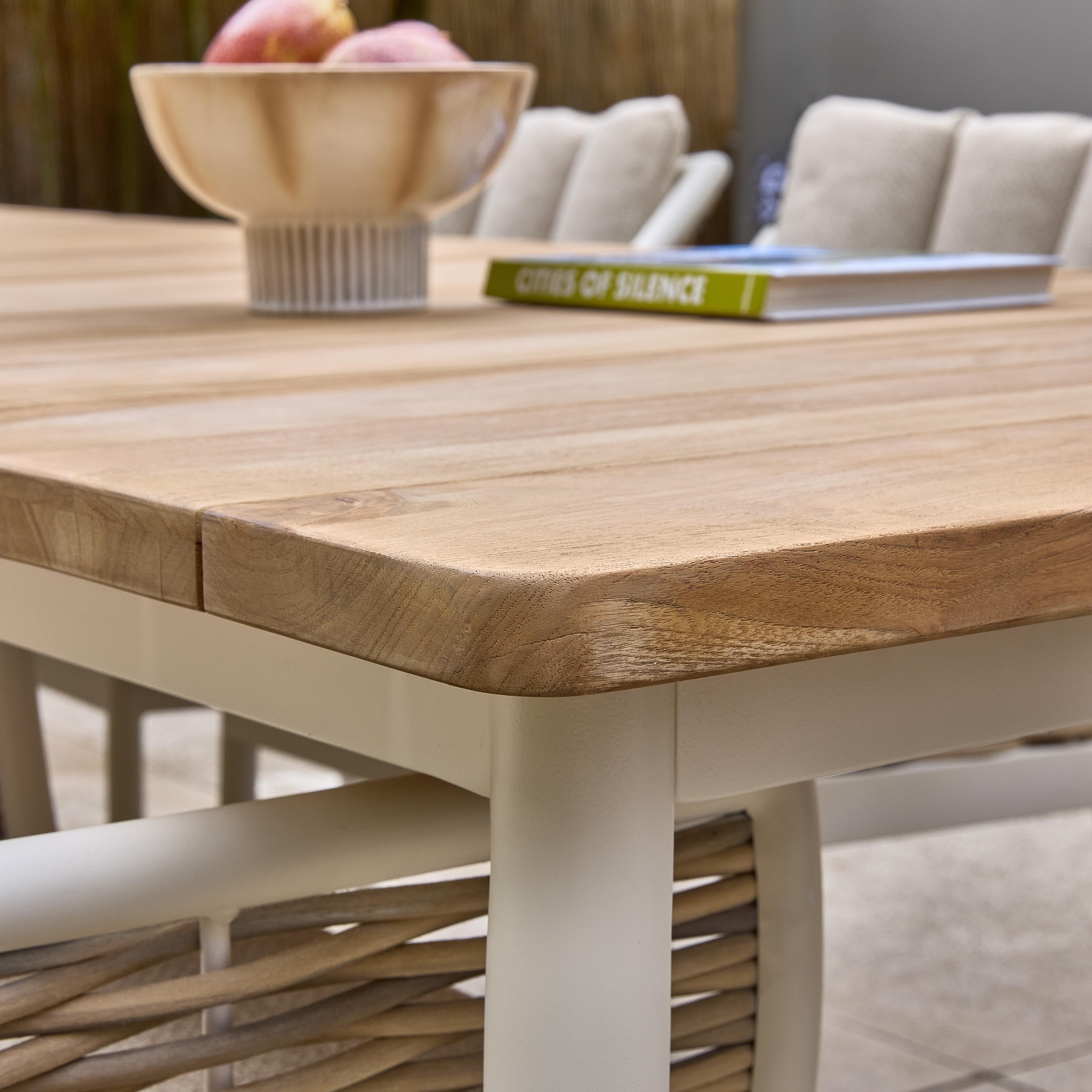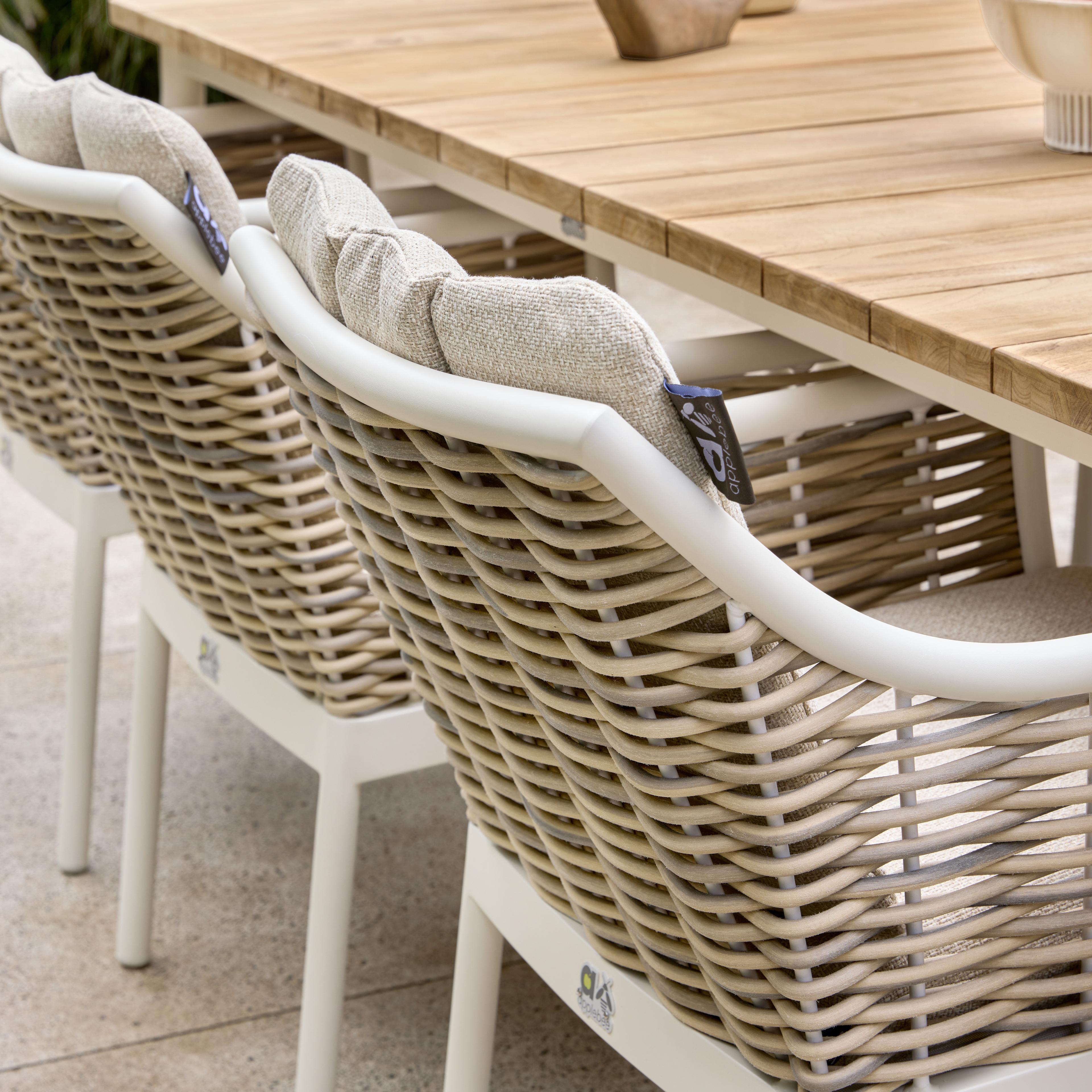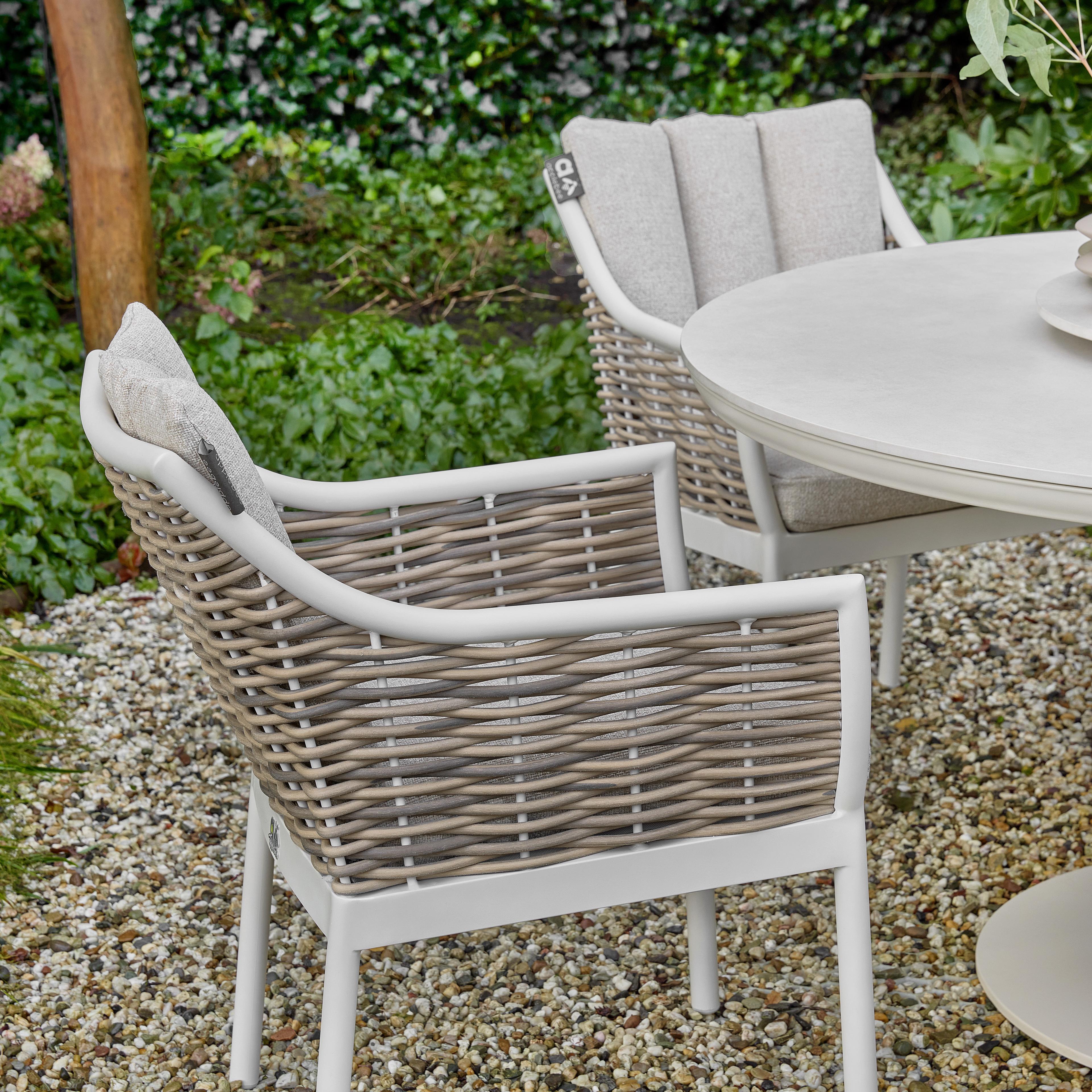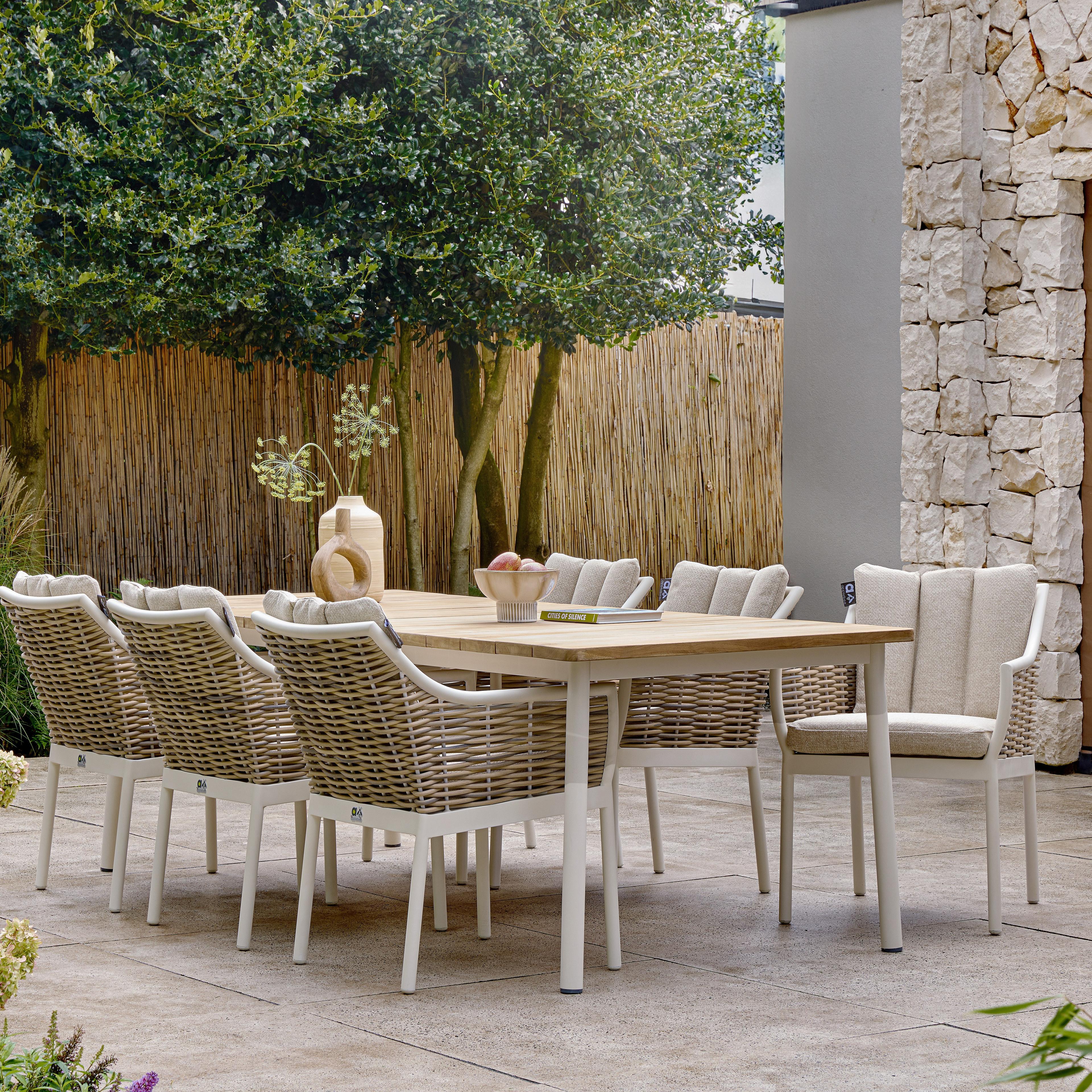 De Milou dining tuinstoel matcht met een teakhouten dining tuintafel zoals Milou en Martinique of met een aluminium dining tuintafel zoals Melville en Zanzibar.