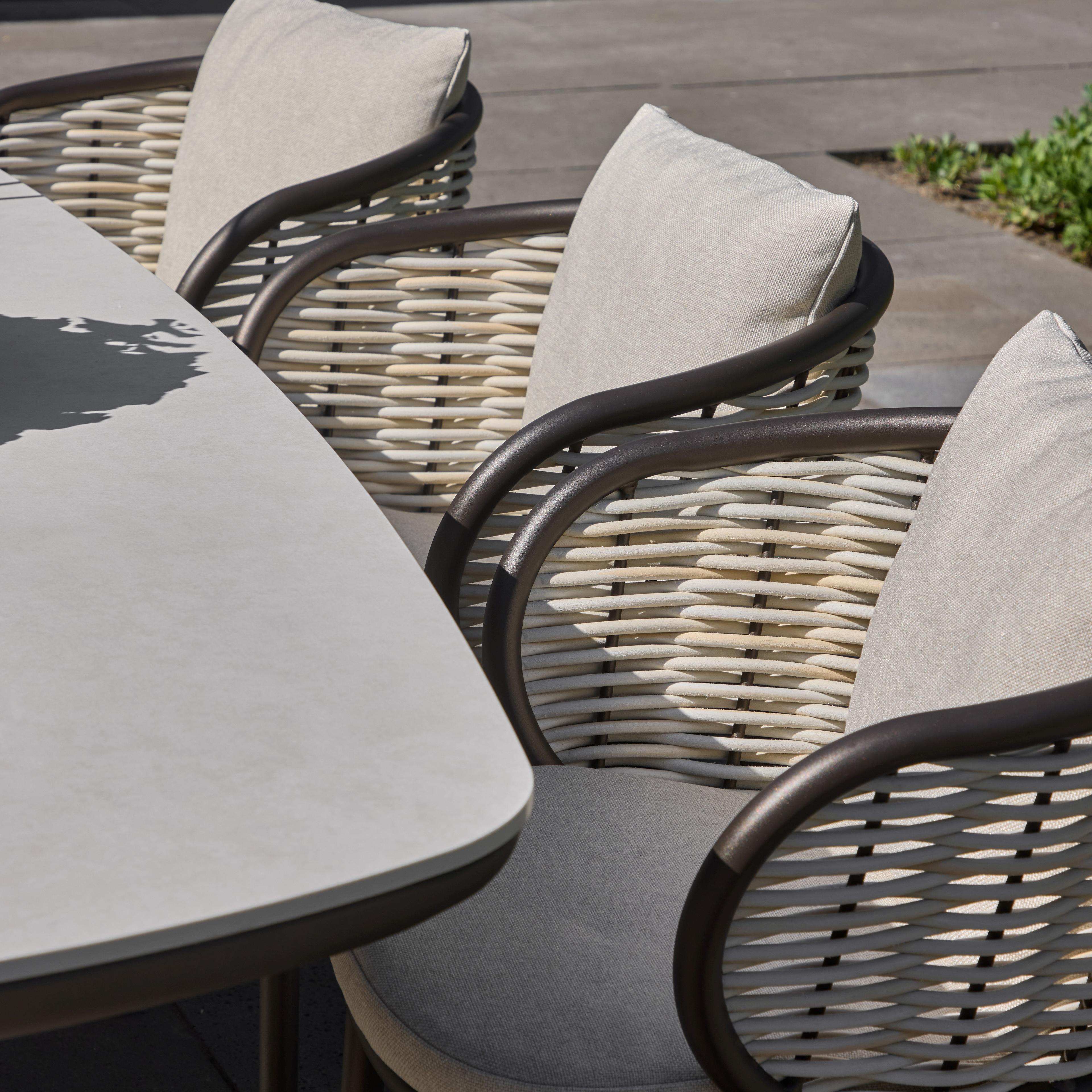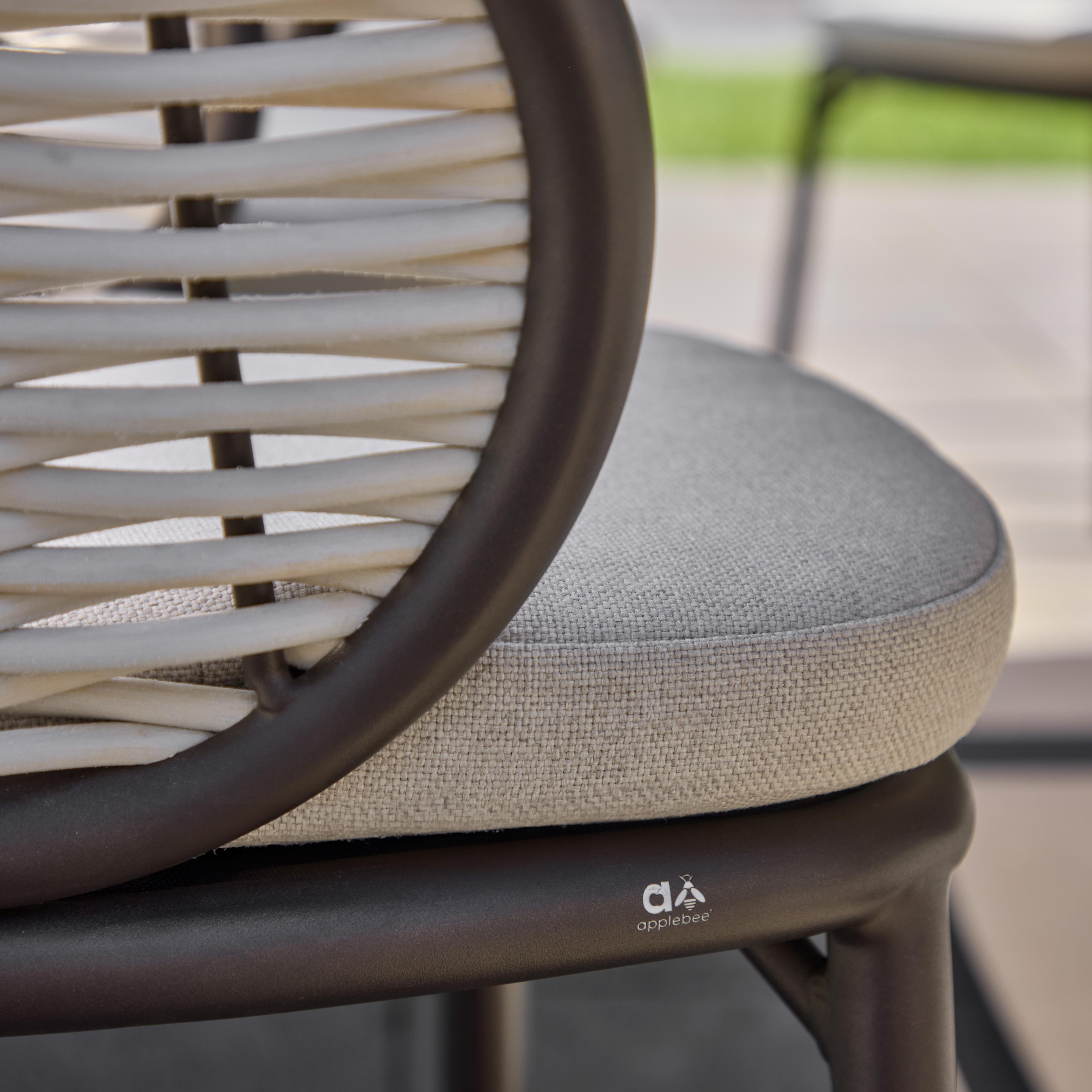 Het warme bronskleurige buisframe contrasteert met de lichte kleuren van de kussens en het Biculair® vlechtdraad. Dit vlechtdraad geeft de Pine Key een luxe, natuurlijke uitstraling.