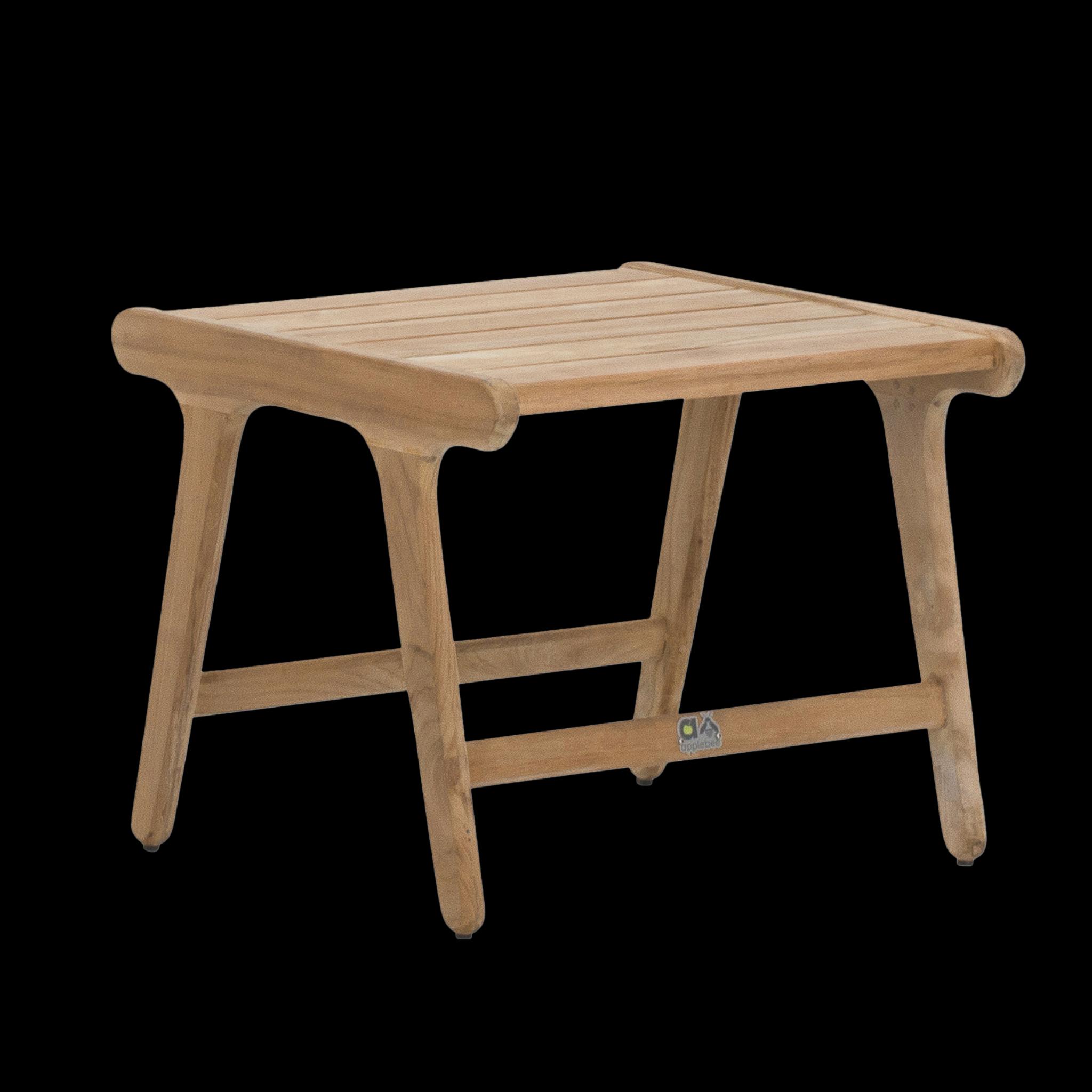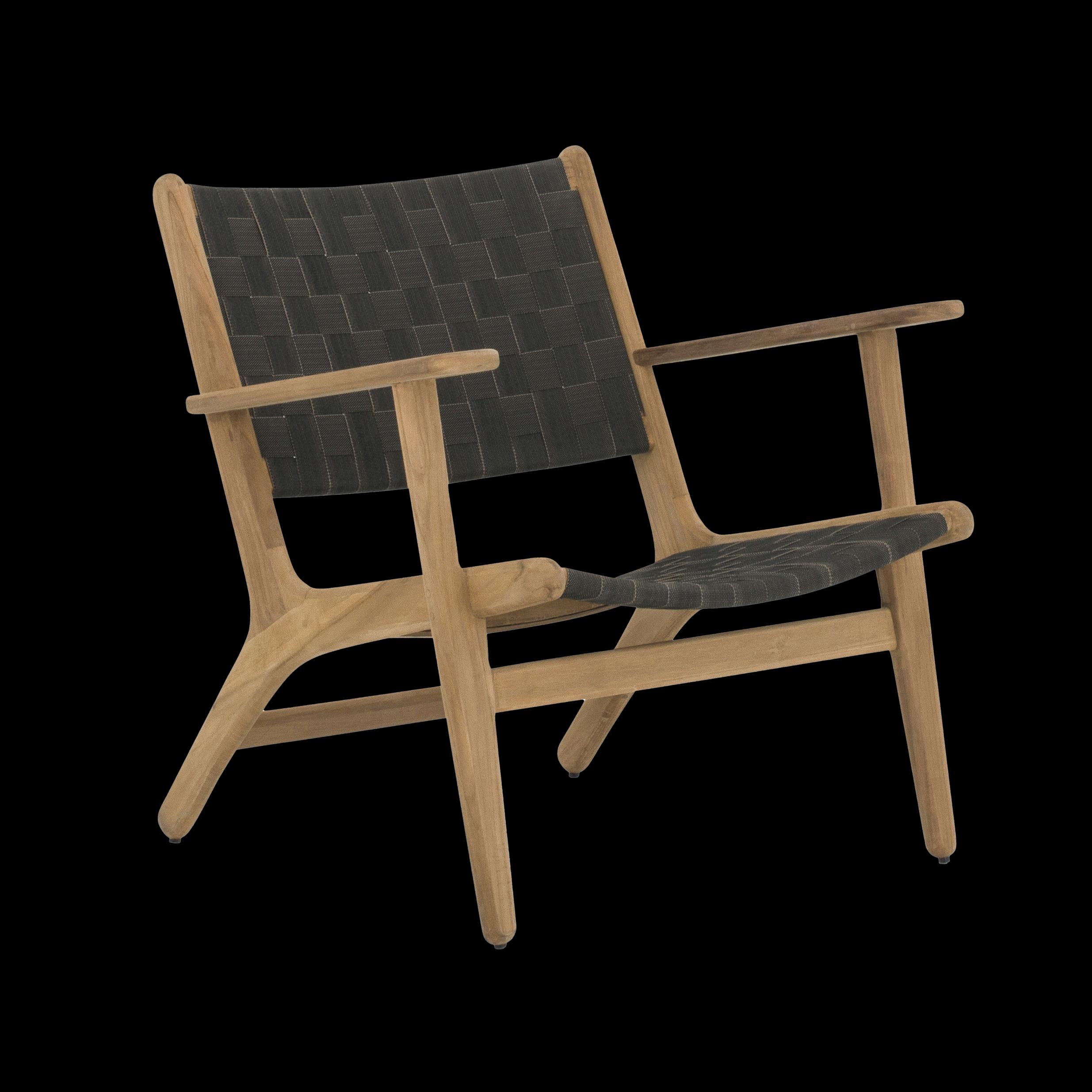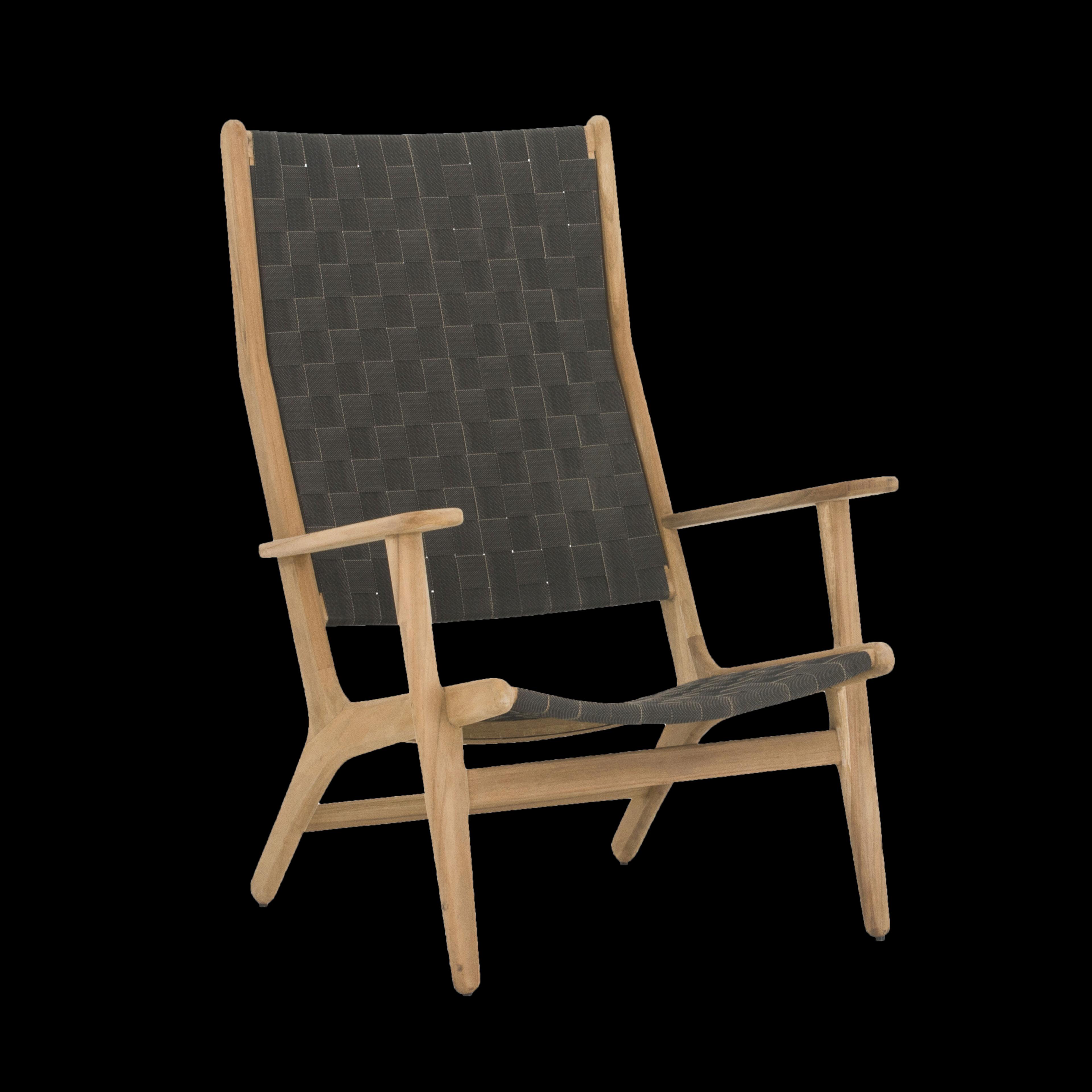 Das Teakholz-Grundgestell ist mit komfortablen und robusten Bändern, den sogenannten Belts, verflochten, die für ein angenehmes Sitzgefühl sorgen. Der Lichteinfall erzeugt einen verspielten Effekt im Belt-Geflecht, wodurch der Hocker eine dynamische Ausstrahlung erhält.