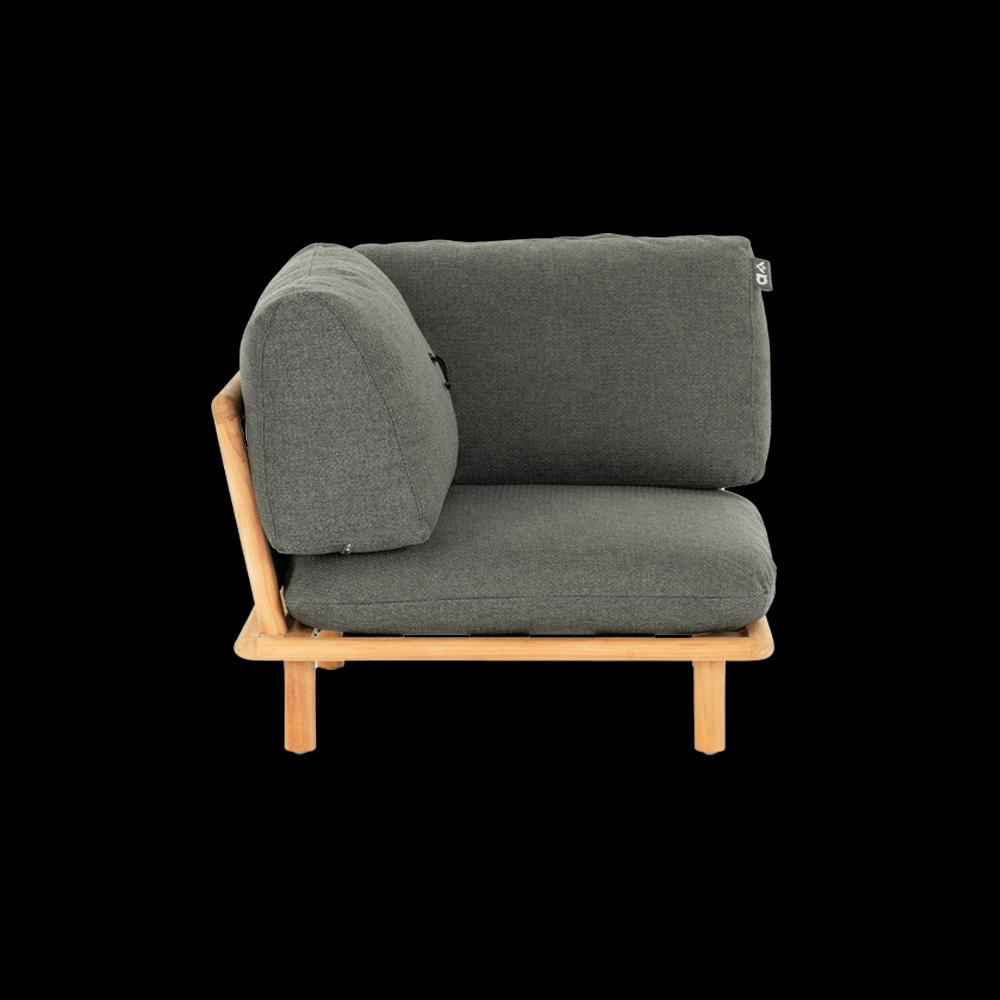 Der Sling ist ein modulares Lounge-Set, das ganz auf Ihre Entspannung ausgerichtet ist. So verfügt zum Beispiel jedes Sitzelement außer dem Eckteil über einen integrierten Beistelltisch, ideal für Ihr Getränk oder Ihr Buch. Das einzigartige Design der Kissen und der Gurte, die sie stützen, unterstreicht die entspannte Atmosphäre des Sling. Ein feiner Knoten im Teakholzrahmen hält das Rückenkissen fest an seinem Platz.