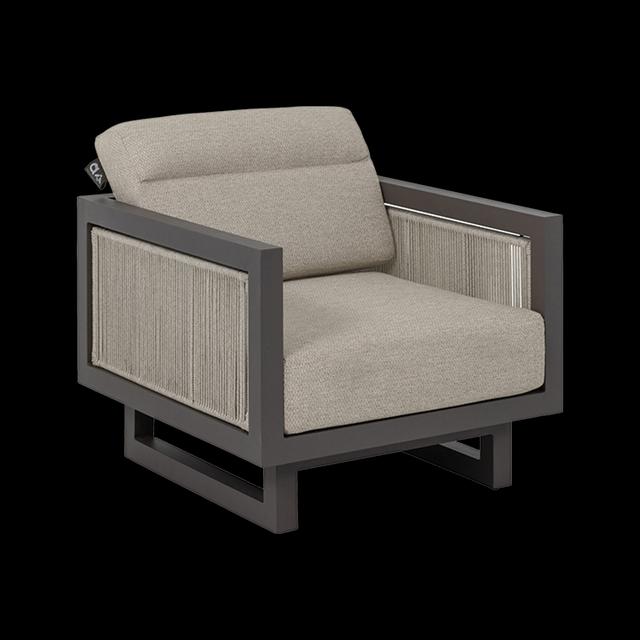 Deze Santorini lounge tuinstoel is gemaakt van een strak, vierkant aluminium buizenframe, gepoedercoat in een stijlvolle taupe kleur. De arm- en rugkussens buigen lichtjes over de armleuningen en voegen een zachte toets toe aan de strakke lijnen. De decoratieve gestoffeerde panelen in de armen en rug geven de set een luxe en eigentijdse uitstraling.