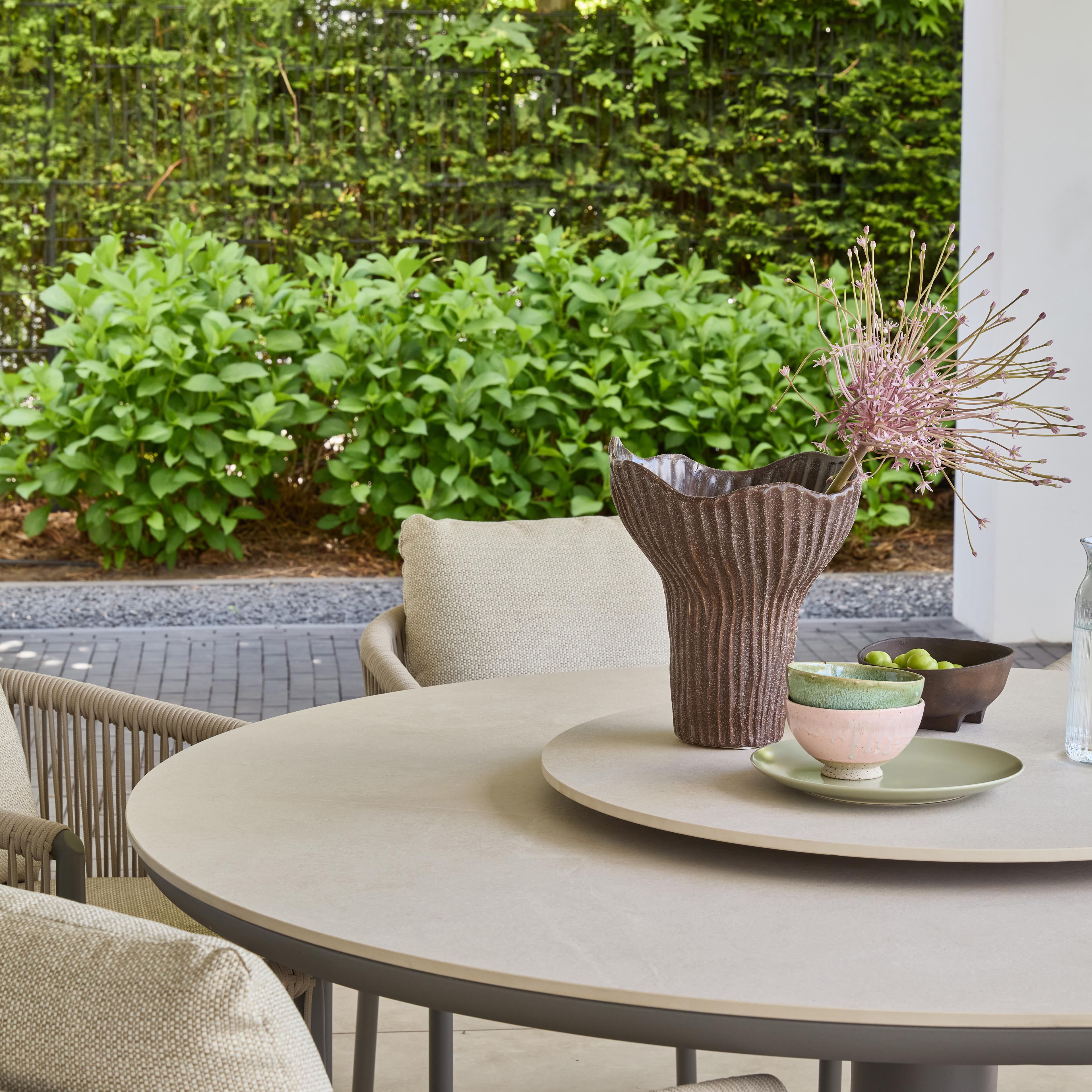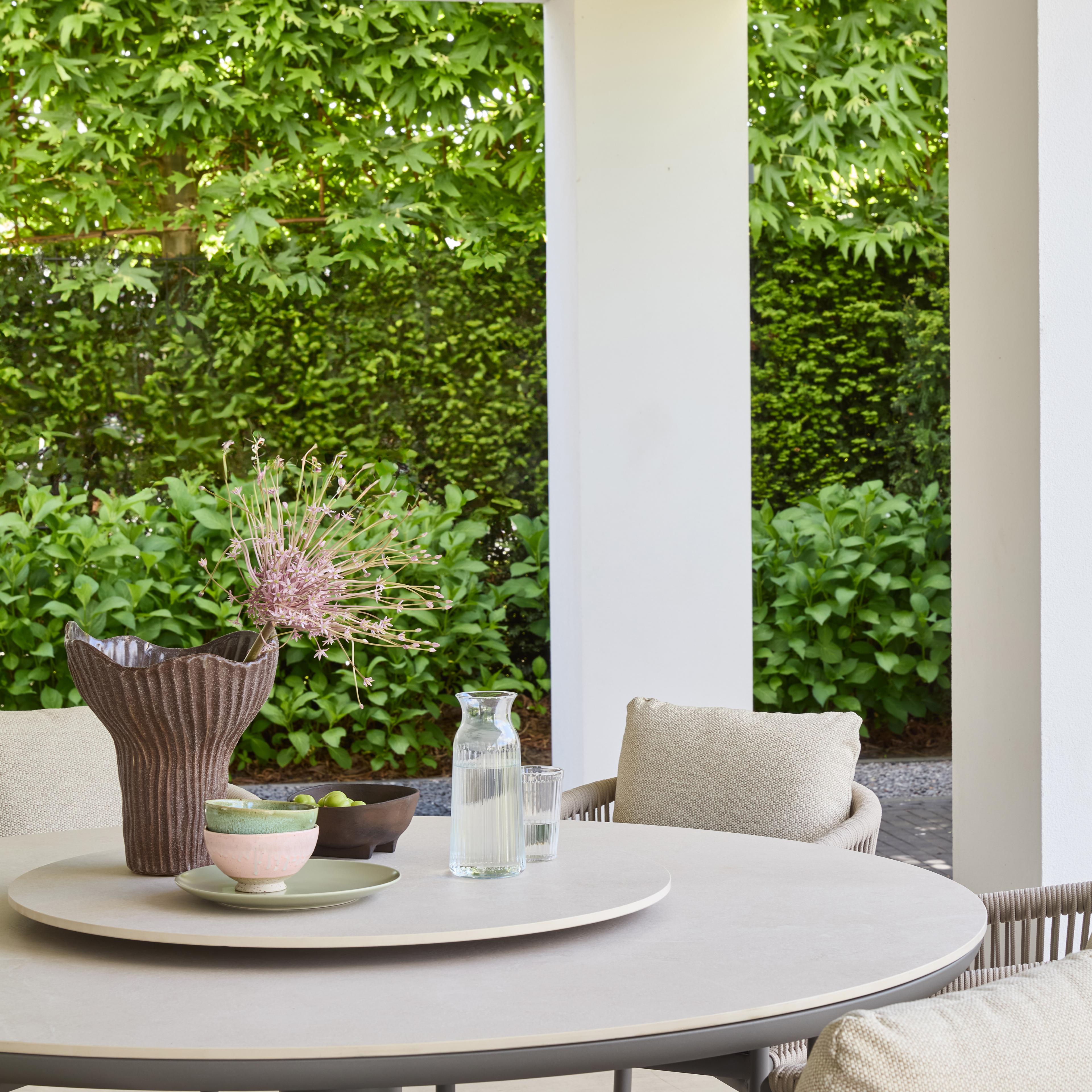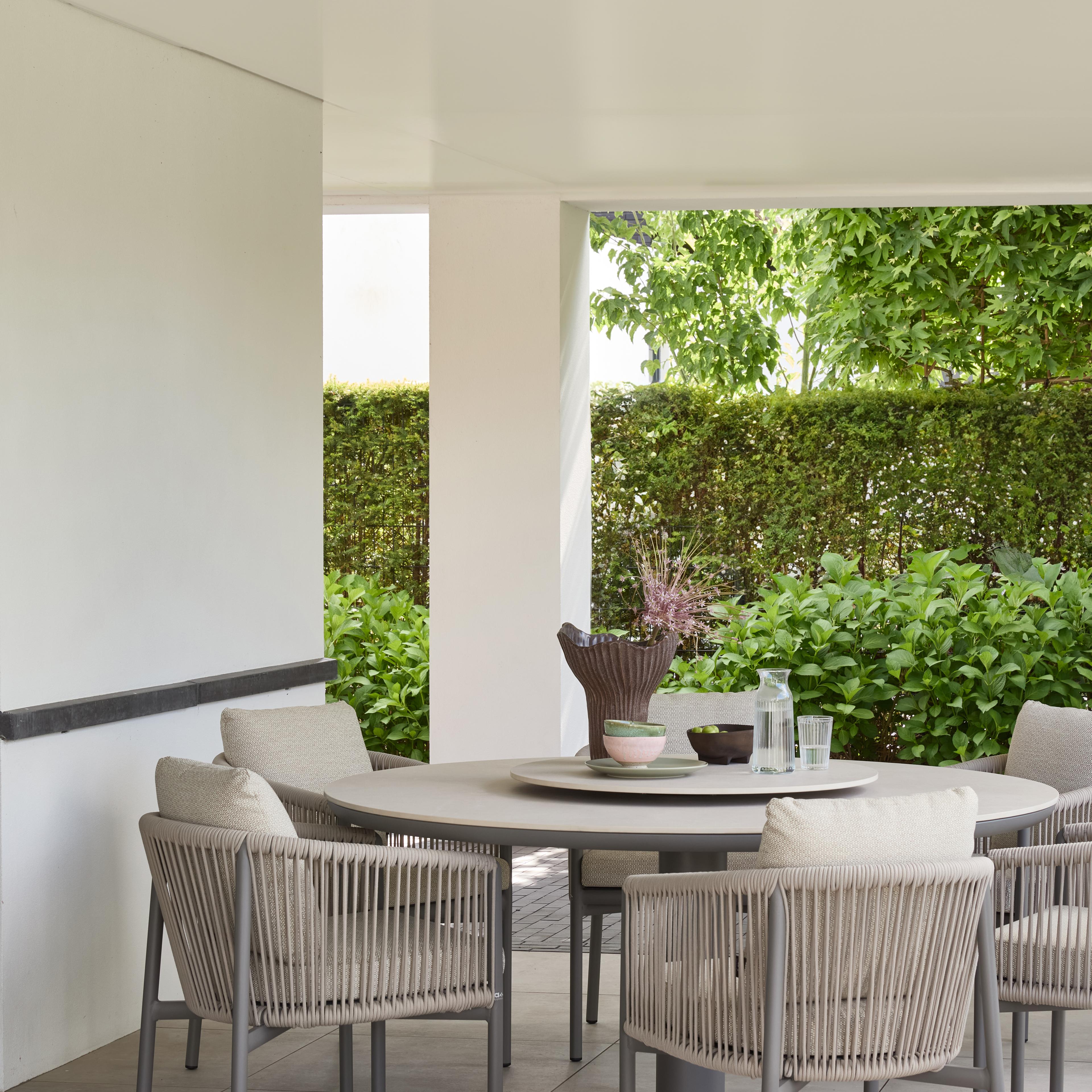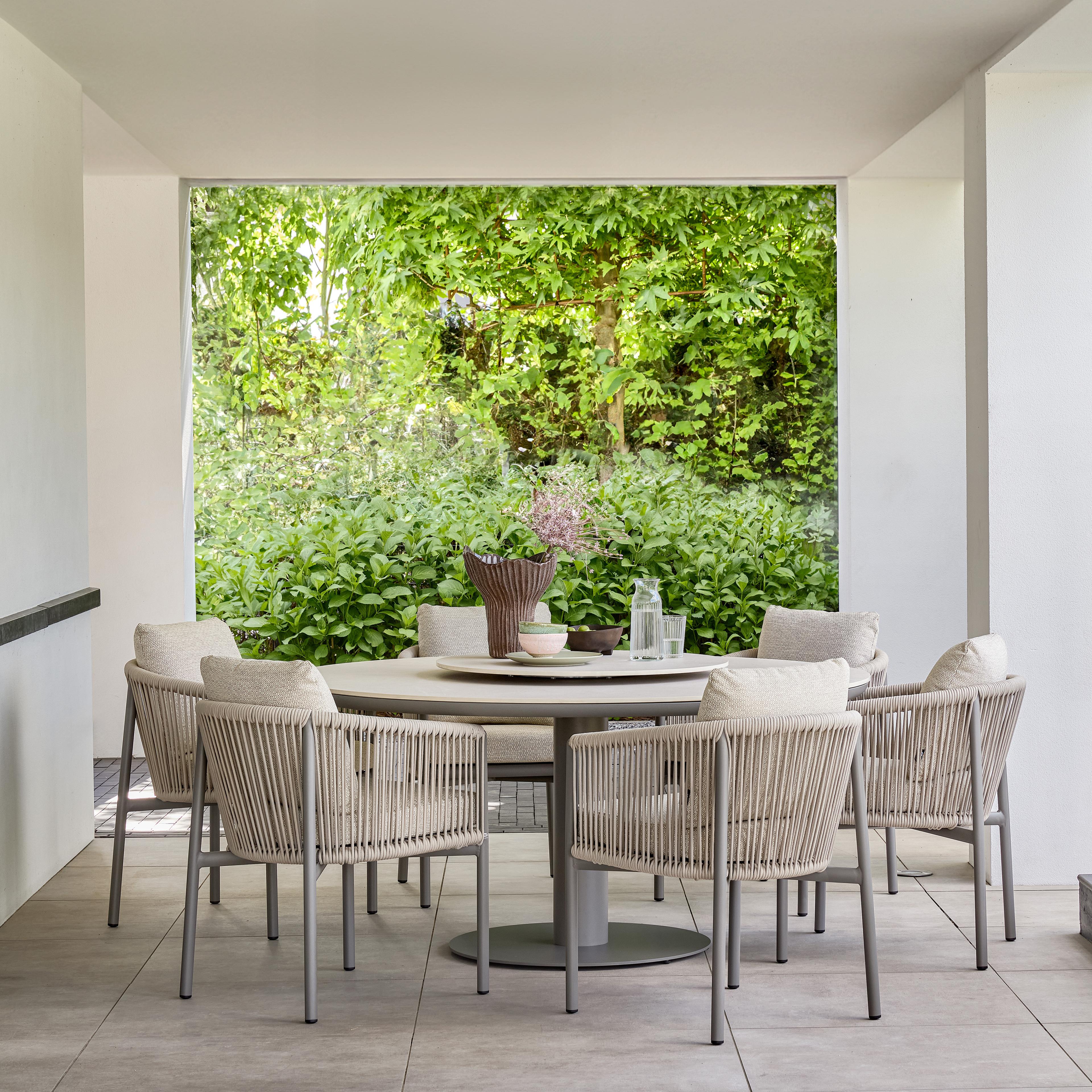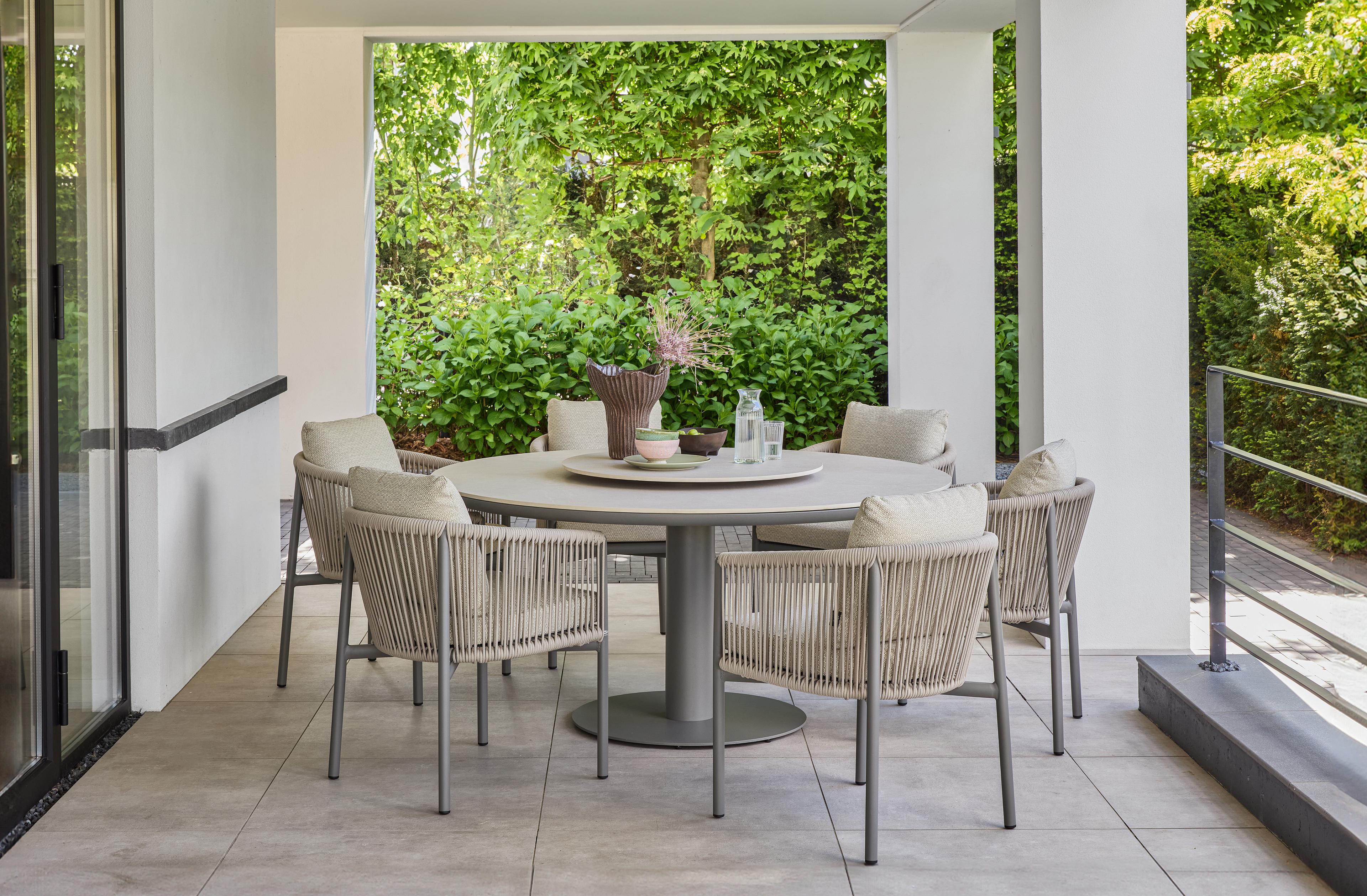 Deze Bora Bora dining tuinset is de ideale keuze voor iedereen die op zoek is naar kwaliteit, stijl en een serene uitstraling. De ton-sur-ton tinten van deze taupe variant zorgen voor een rustige aanblik. Het raffinement van de stoel zit hem in de details: de armleuningen zijn fraai afgeschuind en de achterpoten zijn een tikkeltje verder naar buiten gezet. Het comfortabele rope is buitengewoon sterk en zorgt voor een esthetisch aantrekkelijke transparante look. Deze dining tuinset is verkrijgbaar op standaard hoogte en als low dining tuinset die het midden houdt tussen lounge en dining hoogte. Combineer met de bijpassende Melville of Zanzibar dining tuintafels.