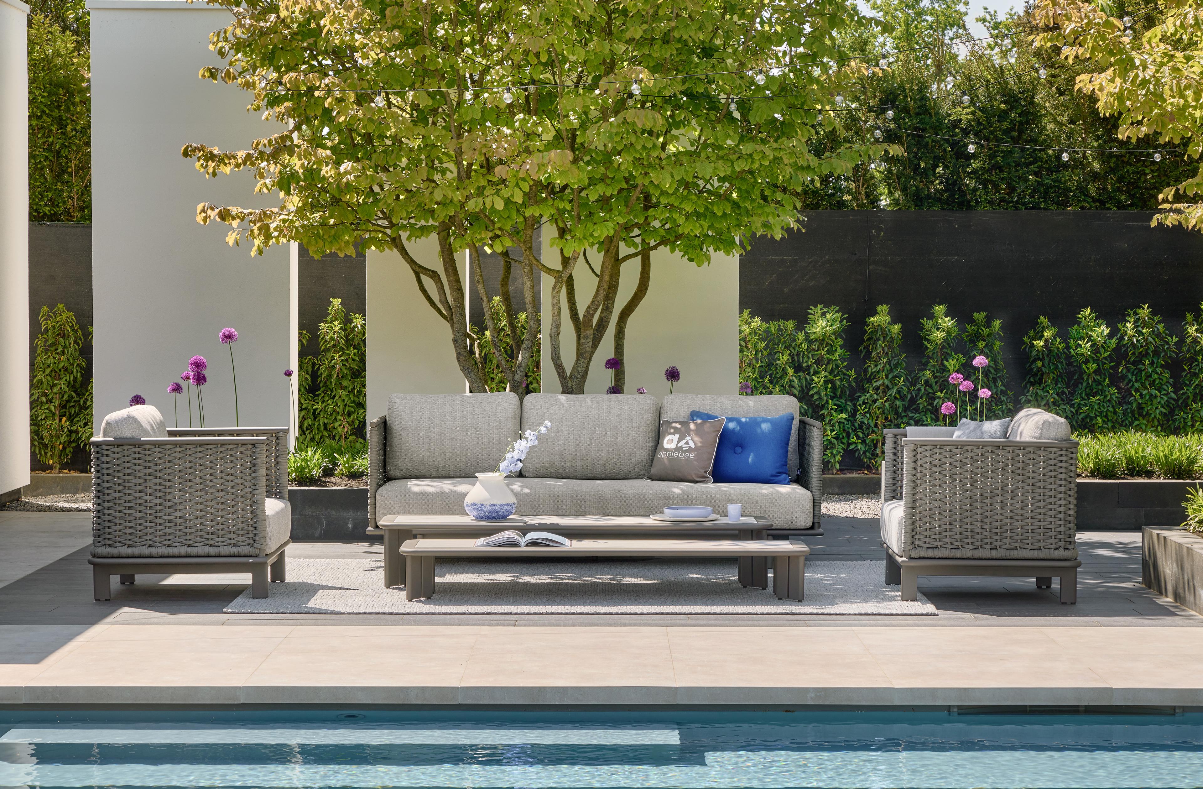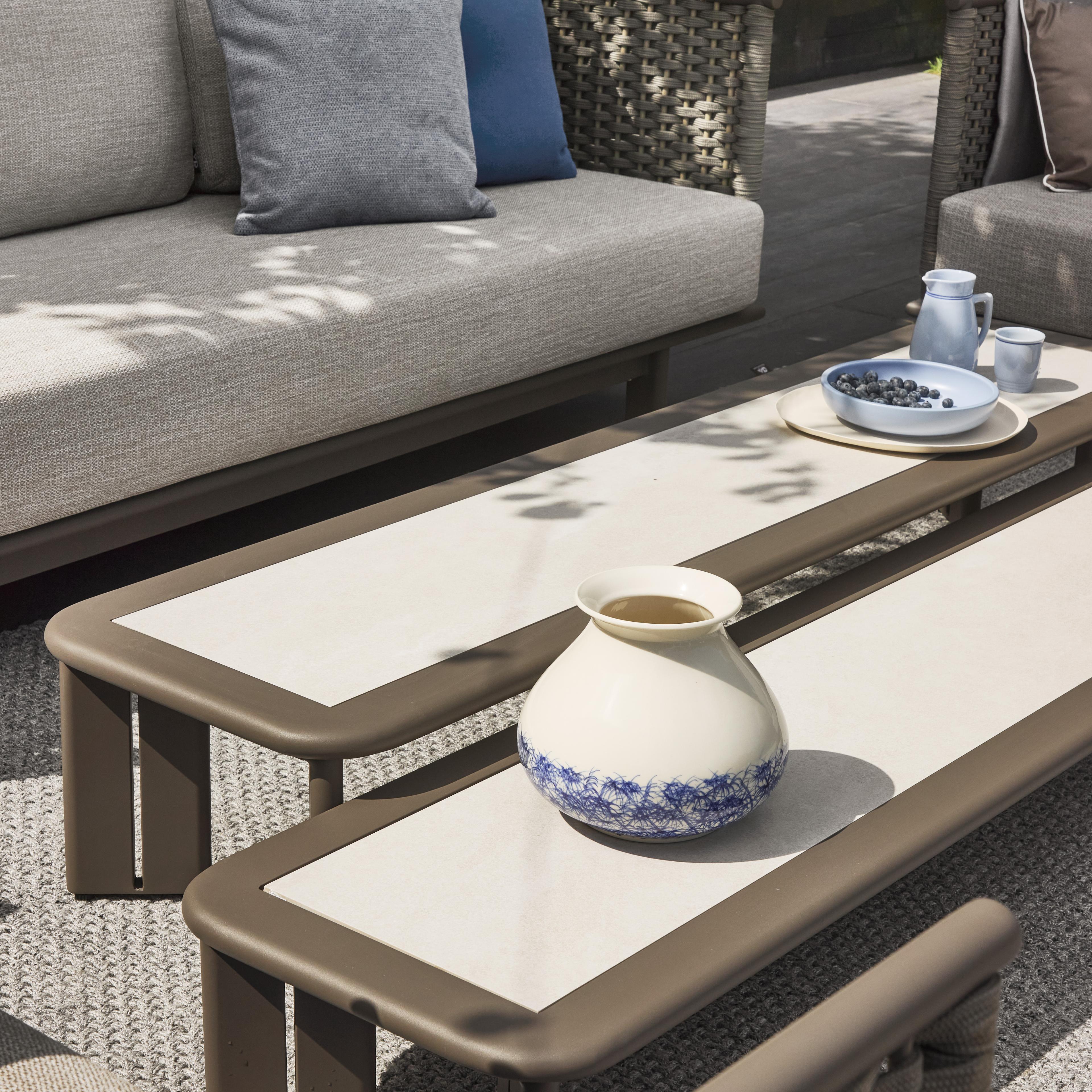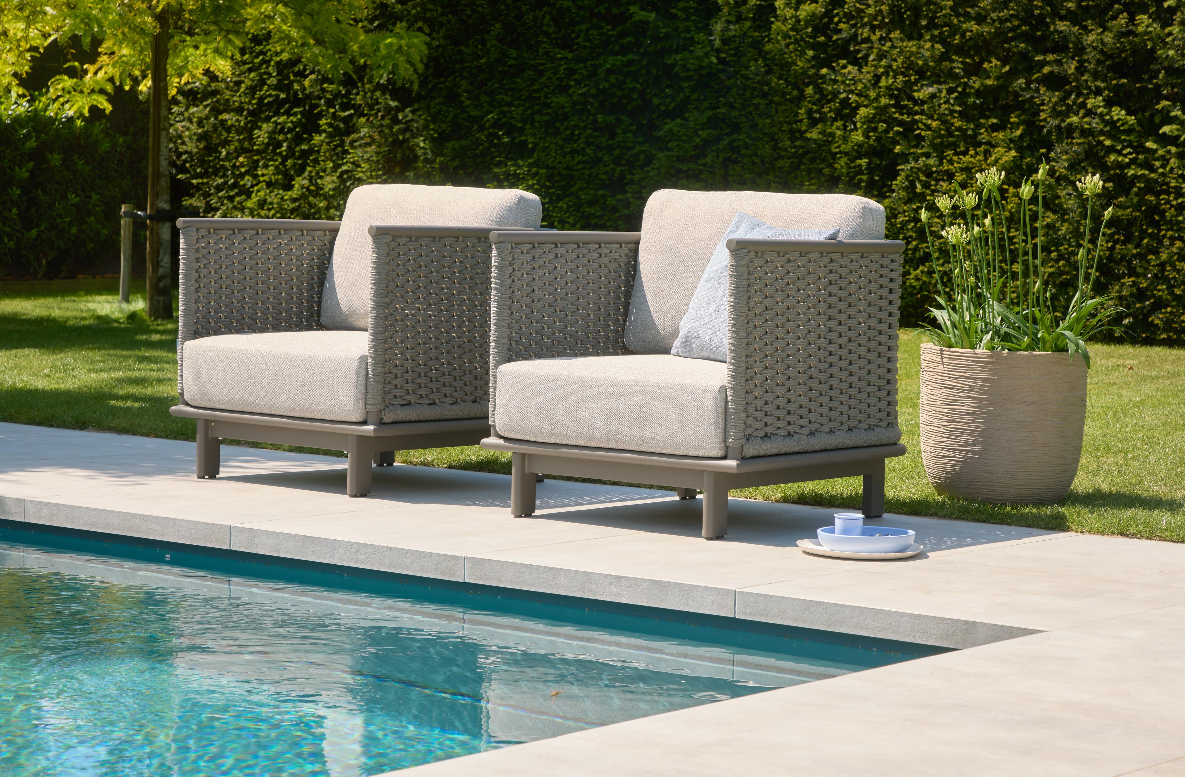 De kubistische vormen van de Brooklyn loungeset zorgen voor een aangename visuele rust en een gevoel van orde en reflectie. Het strakke ontwerp wordt versterkt door het gebruik van flat rope voor het vlechtwerk in warm-grijze materiaaltinten. De Brooklyn is comfortabel ruim vormgegeven, zo ook de bijpassende tafels die in een set van twee geleverd worden. Ze zijn gemaakt van onderhoudsvrij taupekleurig aluminium met een HPMS stone blad in een elegant grijs-wit patroon.