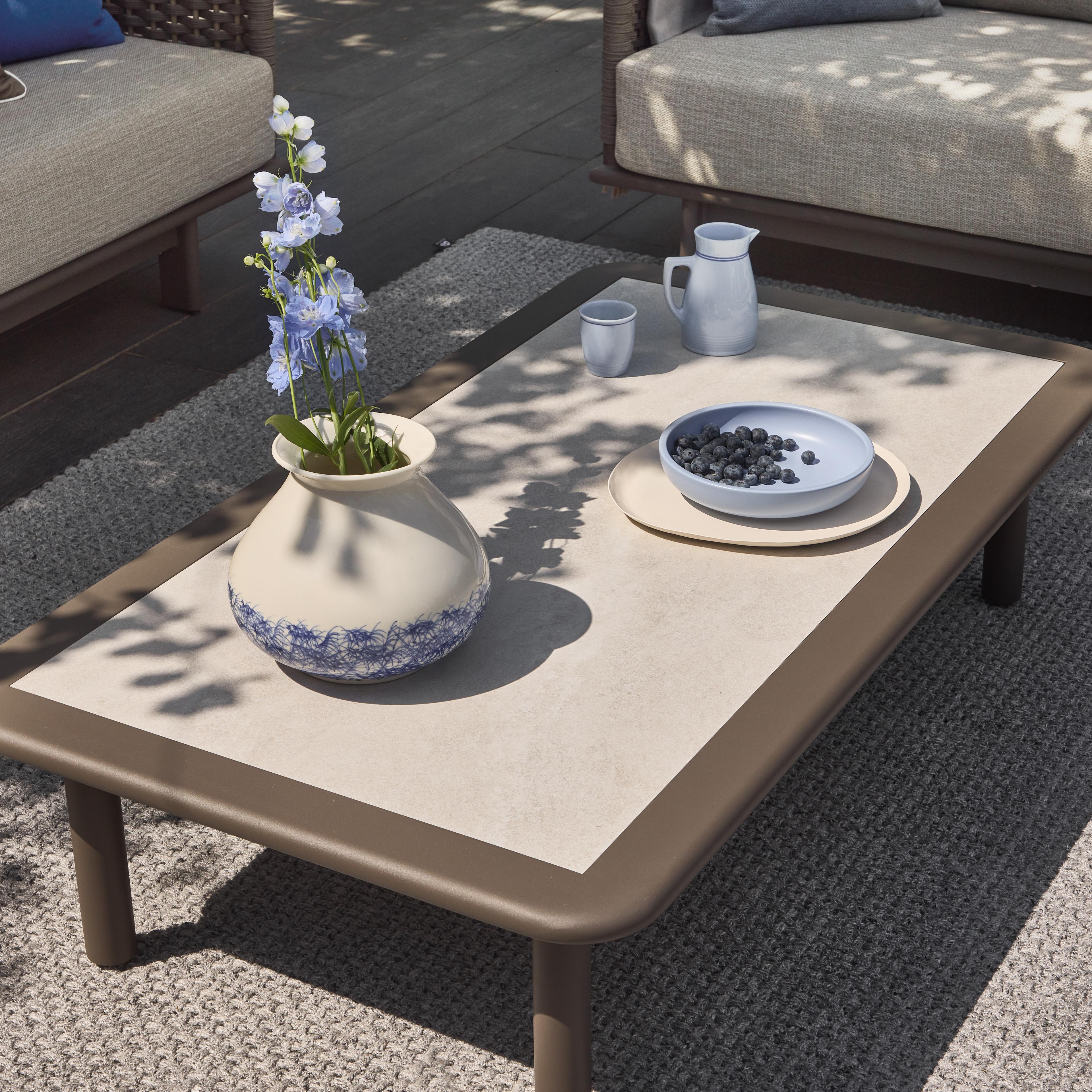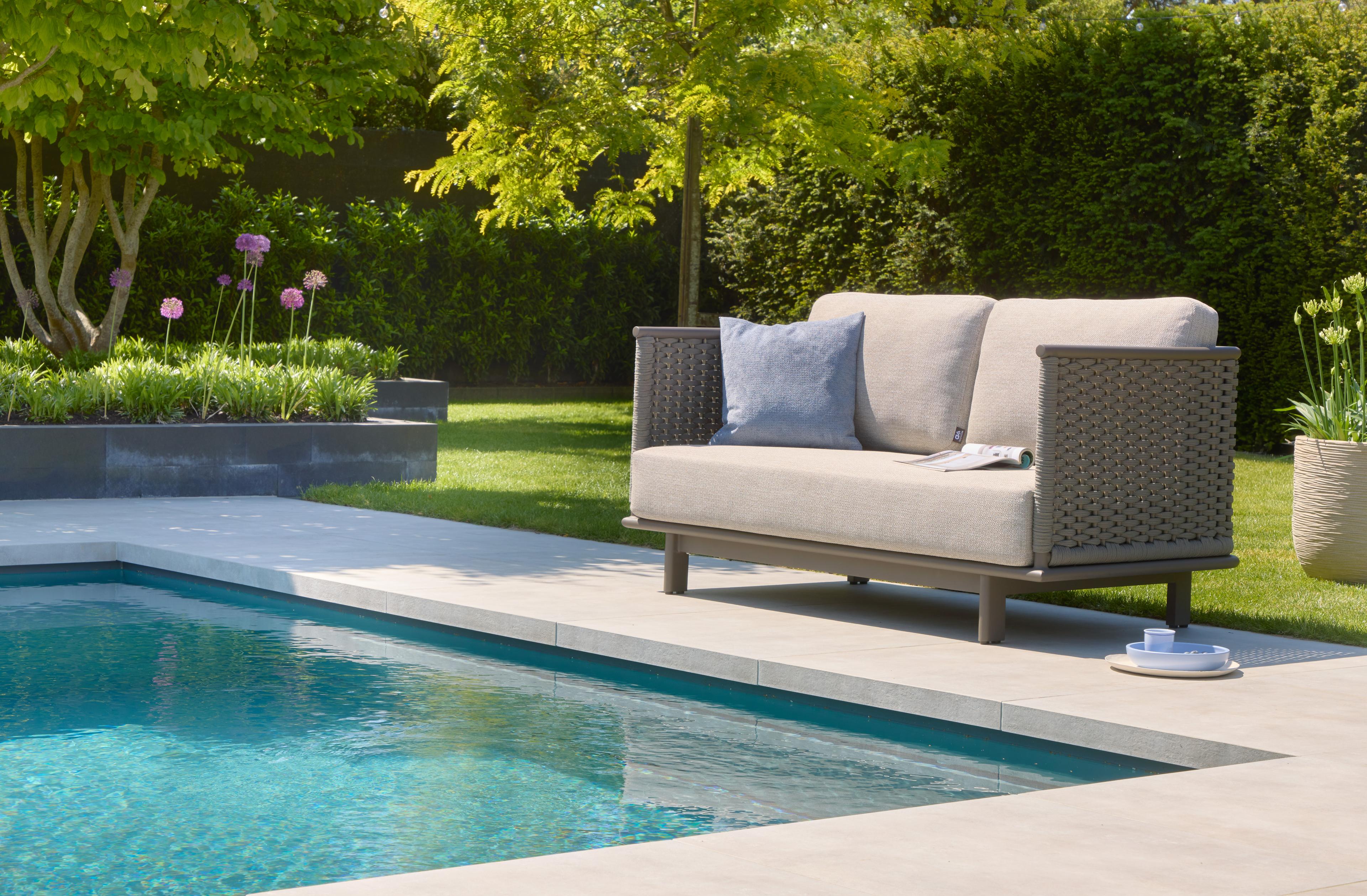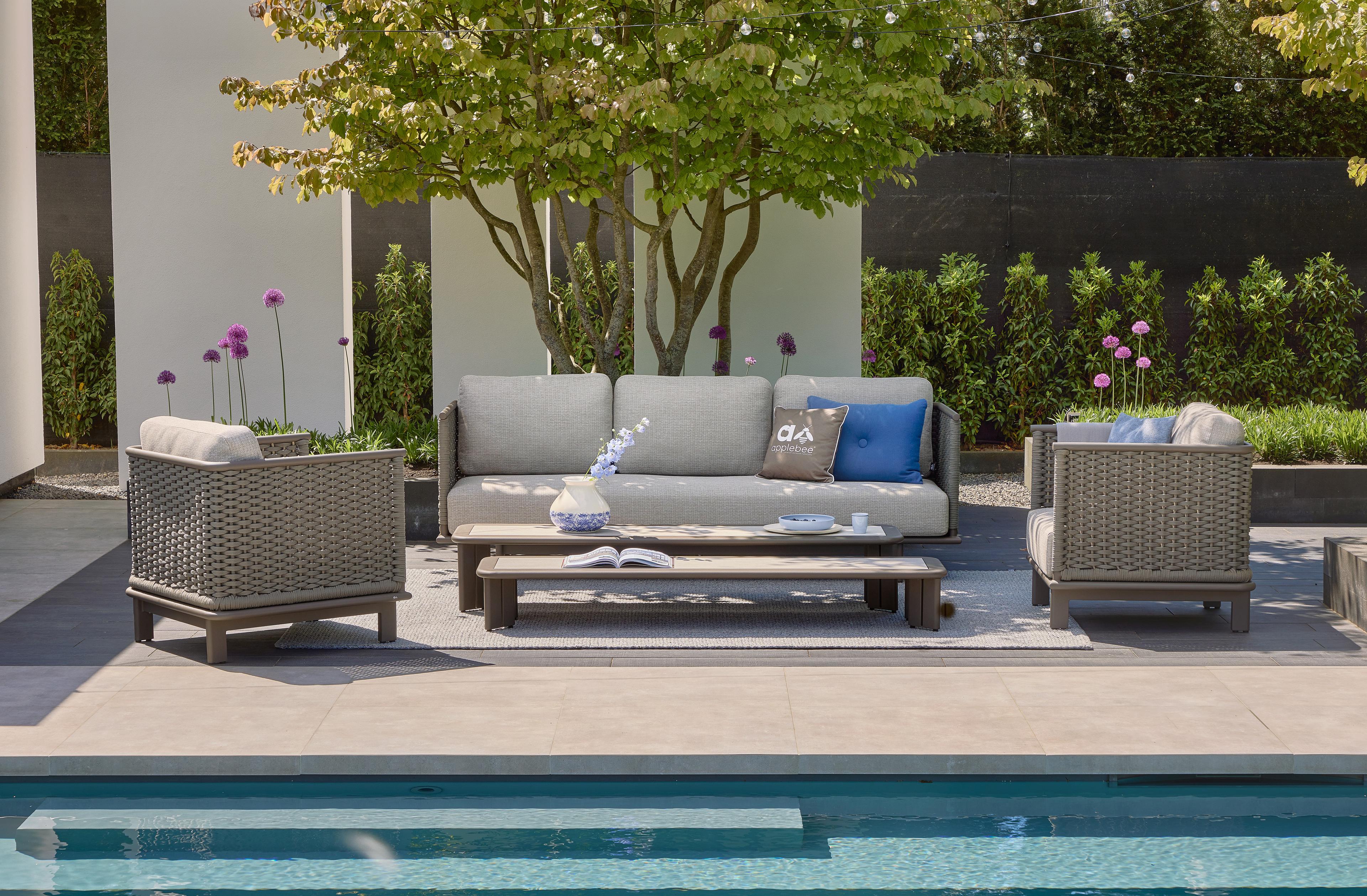 De kubistische vormen van de Brooklyn loungeset zorgen voor een aangename visuele rust en een gevoel van orde en reflectie. Het strakke ontwerp wordt versterkt door het gebruik van flat rope voor het vlechtwerk in warm-grijze materiaaltinten. De Brooklyn is comfortabel ruim vormgegeven, zo ook de bijpassende tafels die in een set van twee geleverd worden. Ze zijn gemaakt van onderhoudsvrij taupekleurig aluminium met een HPMS stone blad in een elegant grijs-wit patroon.