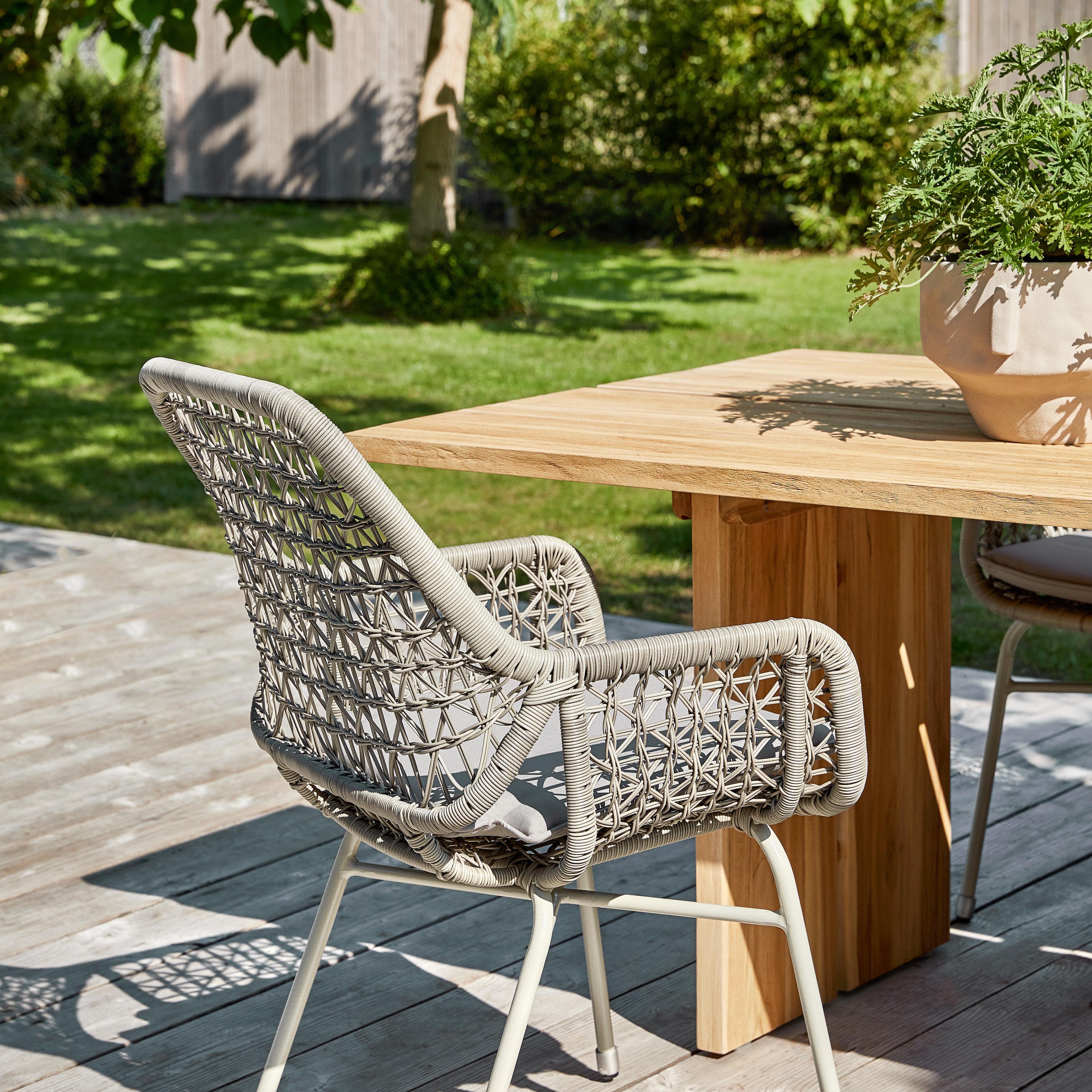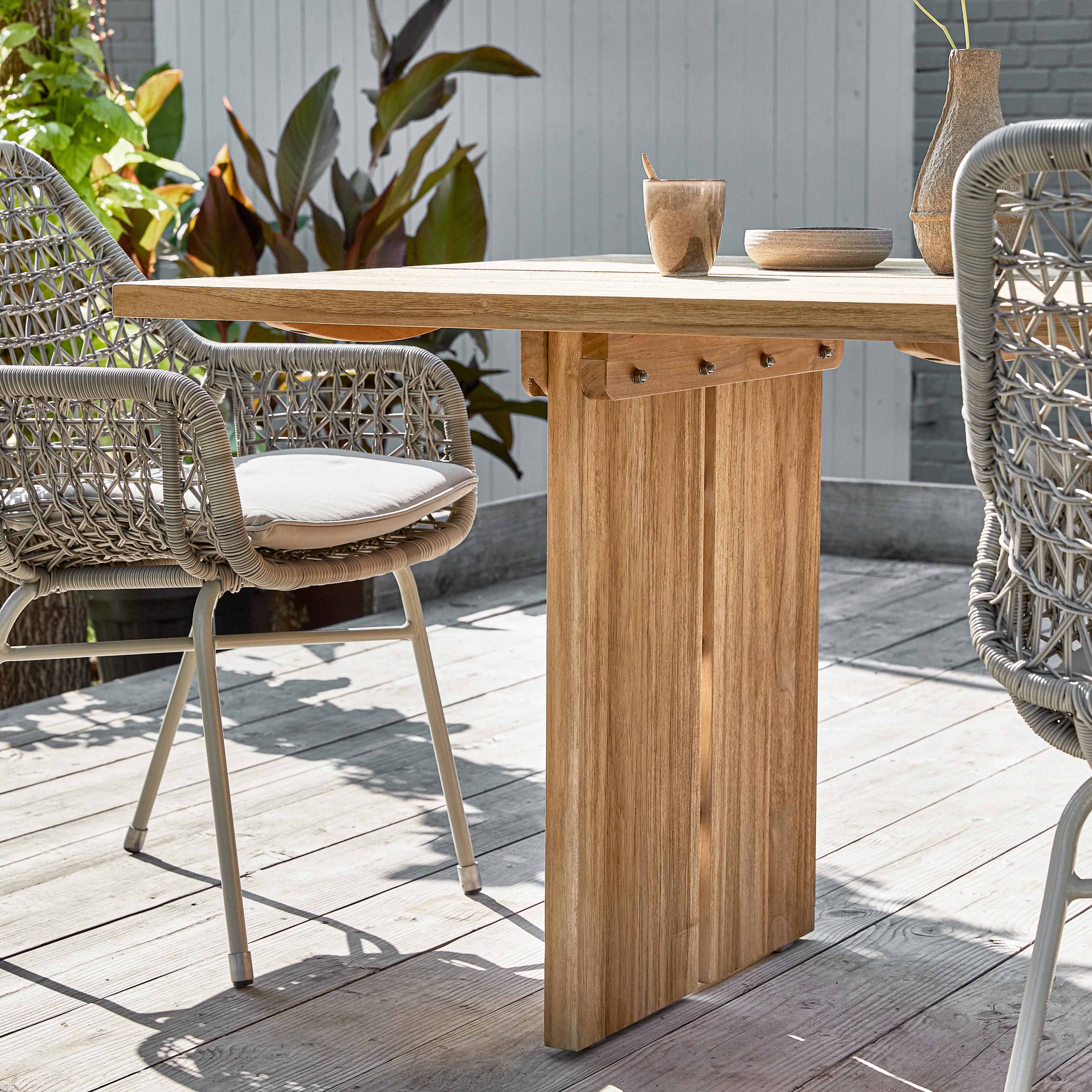 De Joie de Vivre dinning tuintafel is gemaakt van gecertificeerd massief naturel teakhout. De constructie is robuust en duurzaam, terwijl de elegante tussenruimte tussen de twee gelijke delen van het tafelblad en de poten lucht en licht toevoegt aan het geheel. Hij is verkrijgbaar in twee maten, 200 x 100 cm (6 persoons) en 250 x 100 cm (8 persoons). Met zijn pure en verfijnde uitstraling combineert deze tafel moeiteloos met vrijwel iedere eetstoel uit het Apple Bee programma. Denk bijvoorbeeld aan de stijlvolle Gili, de charmante Pine Key of de elegante Zara eetstoelen. De Joie de Vivre dining tuintafel herinnert je eraan dat vaste waarden zoals kwaliteit en authentieke schoonheid blijvend zijn.