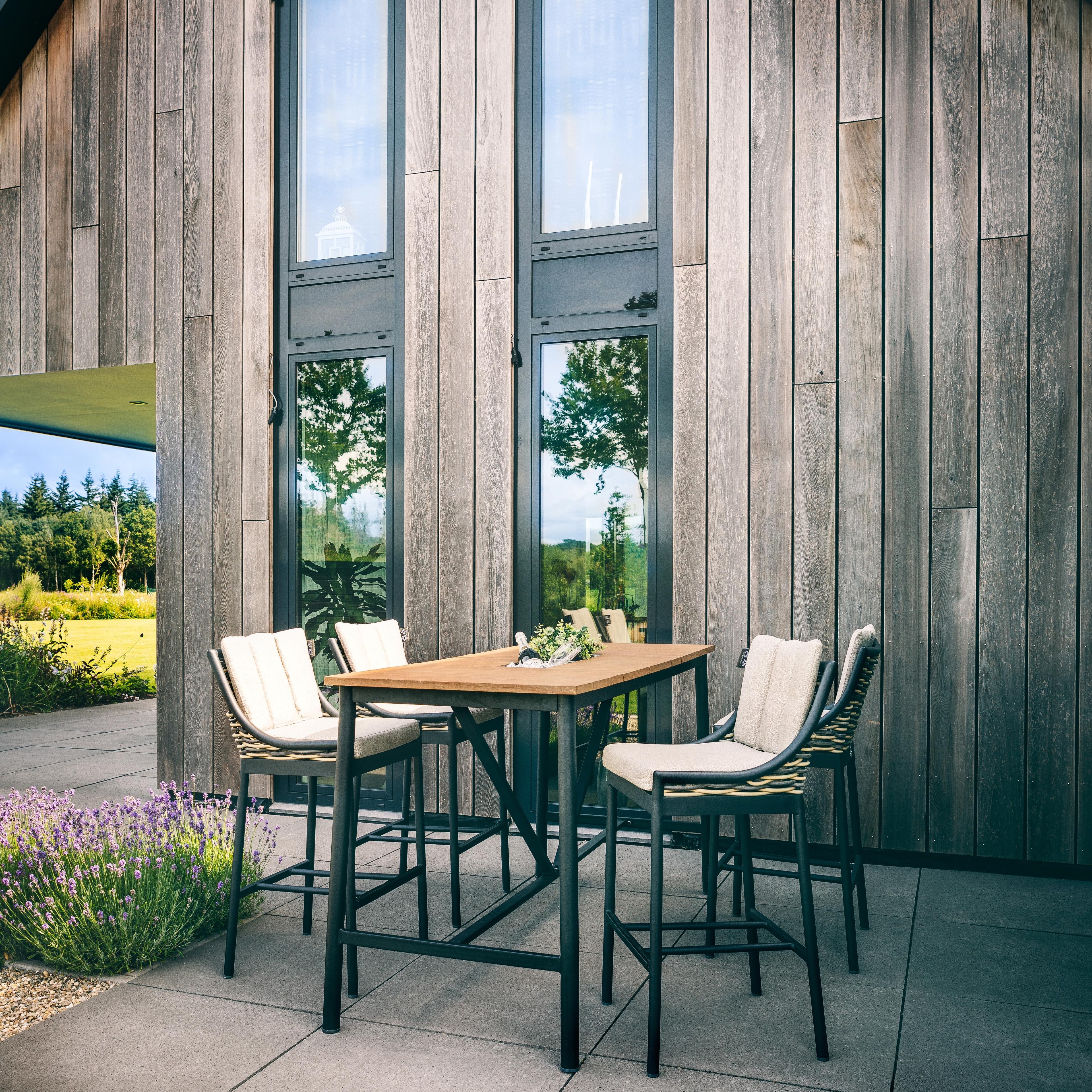 Binnen Milou collectie vind je deze barset, waarmee je een ongedwongen sfeer op je terras creëert. Zachtheid en vriendelijkheid komen samen in het ontwerp van de Milou-collectie. Er is gewerkt met natuurlijke en zwarte tinten die een chique en gestileerde sfeer oproepen. Dankzij de perfecte maatvoering en ergonomie van de barstoelen geniet je van een uiterst comfortabele zitervaring. De tafel heeft een afmeting van 150x78cm en is 105cm hoog. Hij heeft een zwart aluminium onderstel met een naturel teakhouten blad. Alles wat je nodig hebt voor een gezellige avond met familie en vrienden!