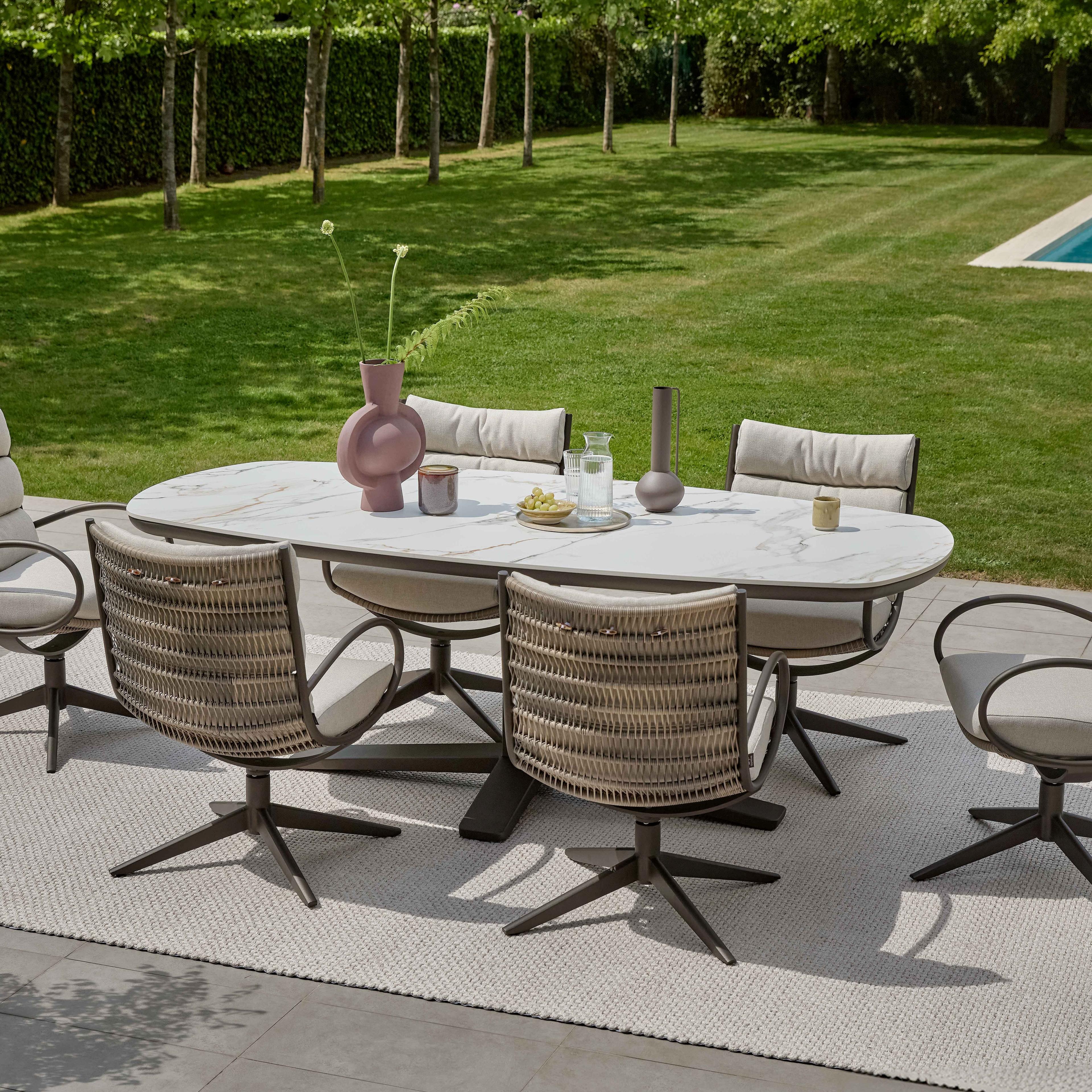 De Zanzibar dining tuintafel past in de retrosfeer van begin 20e eeuw. Net als de originele ontwerpen uit die tijd, zal ook deze Zanzibar na vele jaren niks aan zeggingskracht hebben verloren. Hij blinkt uit in gebruiksgemak. De aluminium tafelpoot is gecentreerd voor optimale beenruimte. Het HPMS Stone tafelblad heeft een zgn. vals-ovaal vorm, die ook aan de kopse zijden volwaardige zitplaatsen biedt. HPMS, wat staat voor High Pressed Mineral Stone, is een innovatief materiaal dat de schoonheid van natuursteen met de voordelen van moderne technologie combineert. Het is extreem sterk, krasbestendig en onderhoudsvriendelijk en daarmee zeer geschikt voor buitengebruik. De Zanzibar is verkrijgbaar in 4 varianten: Bronze frame met Marble blad, Oyster frame met Oyster blad, Taupe frame met Light Grey blad en Black frame met Light Grey blad. Welke sfeer jij ook zoekt, er is altijd wel een passende stoel in de Apple Bee collectie om jouw Zanzibar dining tuinset te personaliseren.