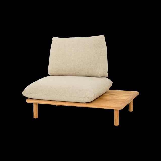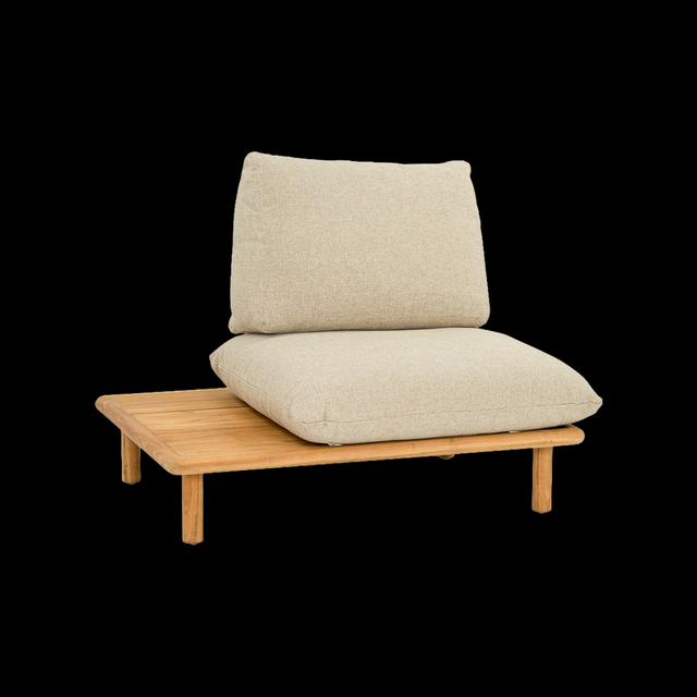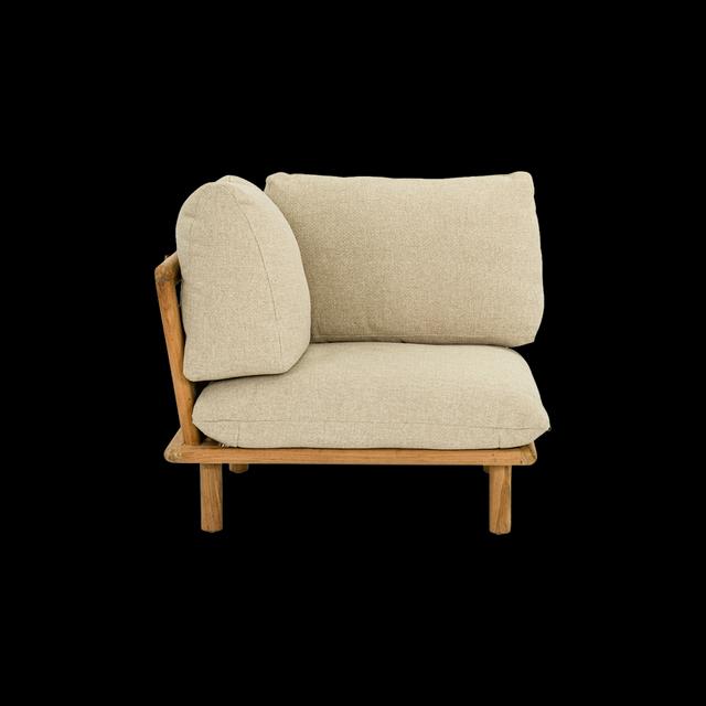 De Sling is een modulaire loungeset die helemaal is ontworpen om je te laten ontspannen. Zo heeft elk zitelement, behalve het hoekelement, een geïntegreerd bijzettafeltje, ideaal voor je drankje of boek. Het unieke ontwerp van de kussens en de banden die ze dragen, benadrukt de ontspannen sfeer van de Sling. Een fijne knoop in het teakhouten frame houdt het rugkussen stevig op zijn plaats.